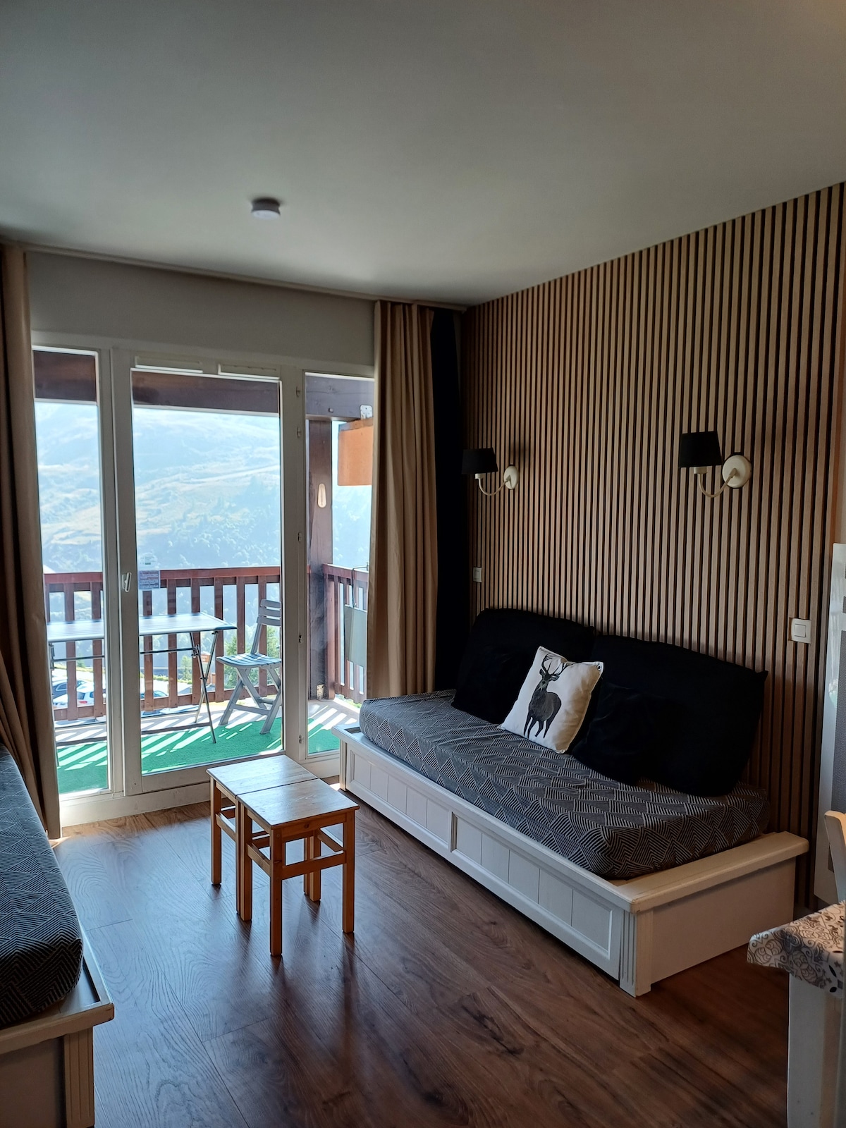 Appartement 28 m² plus balcon – normes PMR -1 900 m d’altitude 1 chambre avec un lit 2 places, salle de bain (douche et WC), kitchenette ouverte sur séjour avec canapé gigogne (2 couchages) Coin cuisine équipé (frigo, micro-onde, lave-vaisselle...) Accès front de neige en bas de l’immeuble -Proximité commerces/restaurants. Déc à avril –juillet et août : Piscine couverte chauffée en accès libre + Salle de fitness (gratuit sur réservation) - Sauna/Hammam/massages (Payant). Arrivée à partir de 15h.