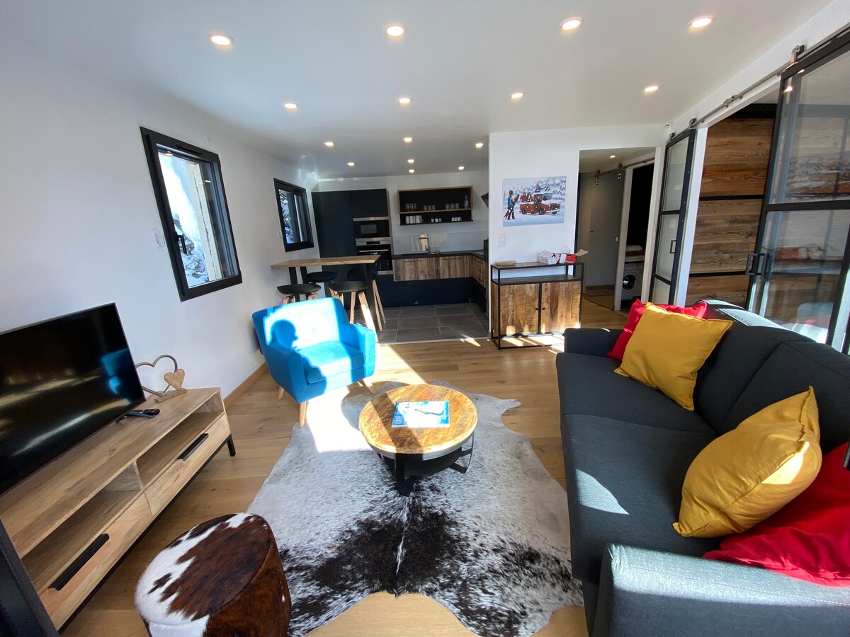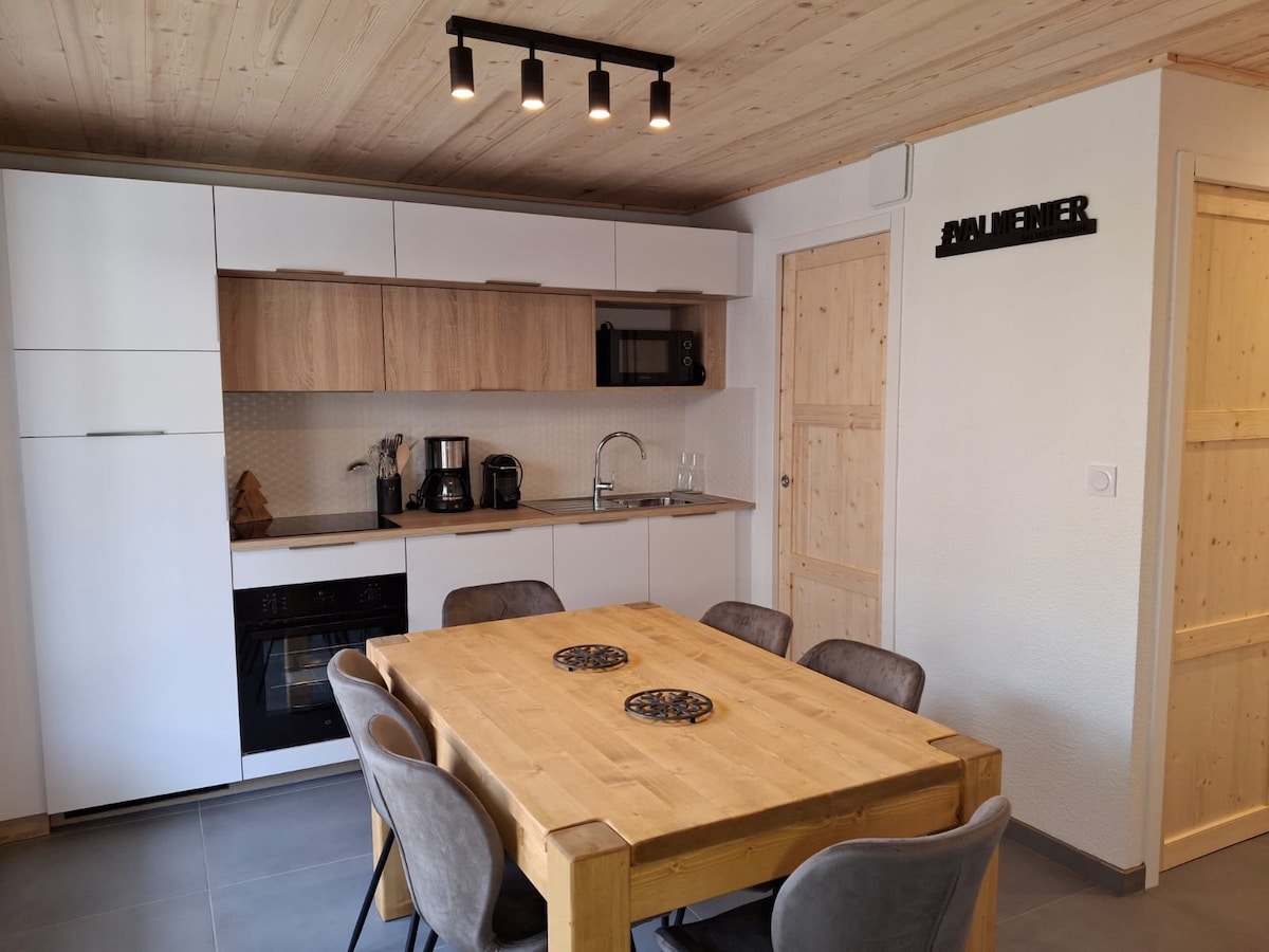 App 2/4 p, 3è étage dans rés. 4* VALMEINIER 1900, 1 chambre lit 160 cm + canapé couch. 160cm. 2 penderies (chambre + salon), tv, SDB avec baignoire - WC séparé Cuisine équipée : Frigo, plaques induction, lave vaisselle, micro-ondes-grill, cafetière filtre + senseo, grille-pain, bouilloire, app à fondue, app à raclette, crêpière, vaisselle. Balcon avec table + 2 chaises + transats, vue sur la montagne expo SO. Draps fournis. Possib. loc du linge toilette, prêt chaise et lit bébé