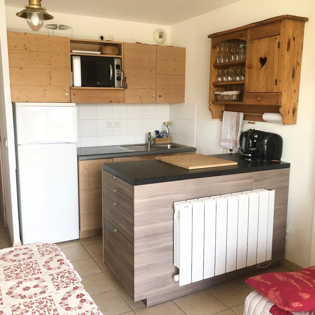 Studio cabine refait à neuf de 17m2, idéal 2 personnes, mais peut accueillir 4 personnes Il dispose de 4 couchages, un canapé lit double dans le salon, et 2 lits escamotables dans l'entrée A 2min à pieds des remontées mécaniques(150m) et proche de tous commerces, un arrêt des navettes gratuite est juste en bas de la résidence L'appartement dispose d'un lave vaisselle, cafetière, grille pain et bouilloire, ainsi que d'un casier à ski Les draps, serviettes et le ménage sont compris Wifi gratuit