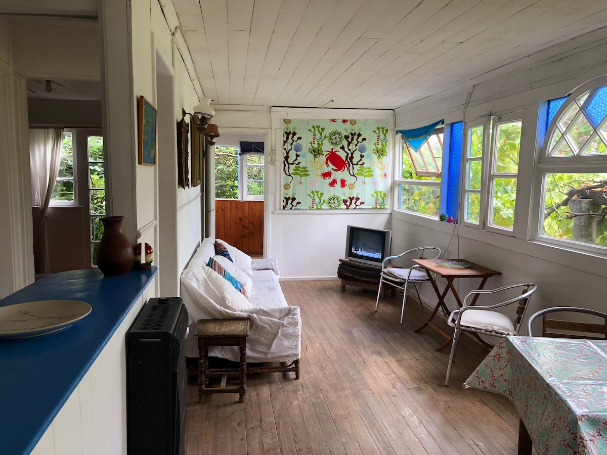 Cabaña interior muy luminosa, cómoda, 2 habitaciones c/2 baños, cocina abierta a sala grande con ventanales, escritorio con wifi, cable TV, muy segura, sector Agua Santa, acceso inmediato desde Santiago, a 15 minutos de la playa y centro (a pie la subida es empinada), locomoción a Valparaíso y playas. La cabaña está recién restaurada, el techo es nuevo. Hermosamente decorada.Utensilios básicos para cocinar. Proveo sábanas y toallas limpias y me preocupo en primera persona de la limpieza.