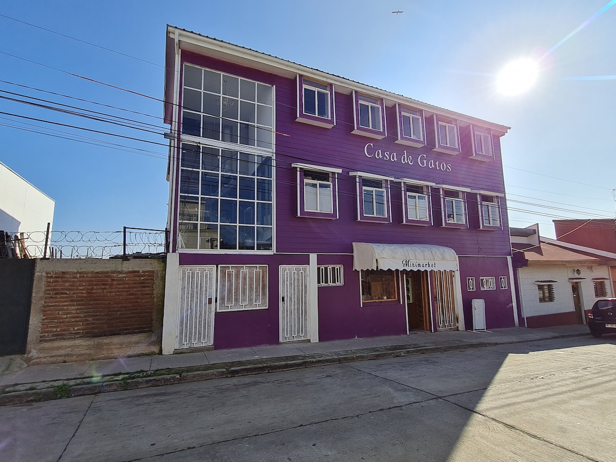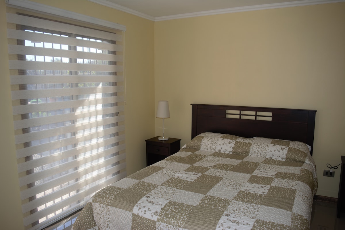 Habitación con cama matrimonial, baño privado y cocina privada, ventana con luz solar, wifi y agua caliente. Supermercados y locomoción muy cerca. Estacionamiento afuera de la propiedad. IMPORTANTE: por seguridad, NO se aceptan personas fuera de las indicadas al momento de la reserva, o diferentes de las que ingresaron el primer día.
