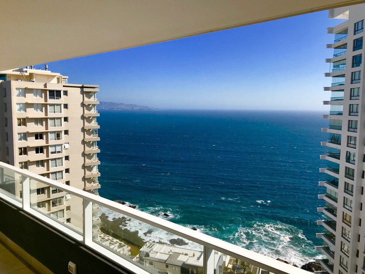 Bienvenidos a nuestro espacio hermosamente equipado en primera línea frente al mar, con estacionamiento privado. Se encuentra a pasos de playa Cochoa, y podrás caminar por el borde costero saliendo del edificio a 5 minutos de Reñaca. Una elegante decoración y espacio 100% equipado, para tener todas las comodidades en un solo lugar. Todo pensado para que tu estancia sea una excelente experiencia. Estarás cerca de supermercado, restaurantes, farmacias, bares, transporte publico todo caminando.