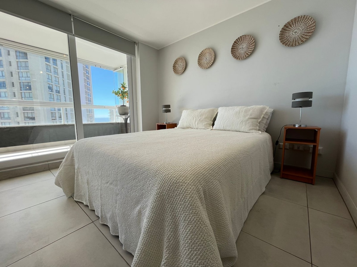 Despierta con una vista al mar completamente despejada — real y panorámica. Terraza amplia ideal para desayunos, sunset o home office. Departamento moderno de 1 dormitorio en una de las mejores zonas de Concón, a minutos de playa, gastronomía y supermercados. Perfecto para parejas que buscan descanso, viajeros que quieren teletrabajar con vista o quienes quieren disfrutar el verano a pasos del mar. estacionamiento privado subterráneo -Wifi rapido- 100% Petfliendly- a 7 min caminando de las Dunas