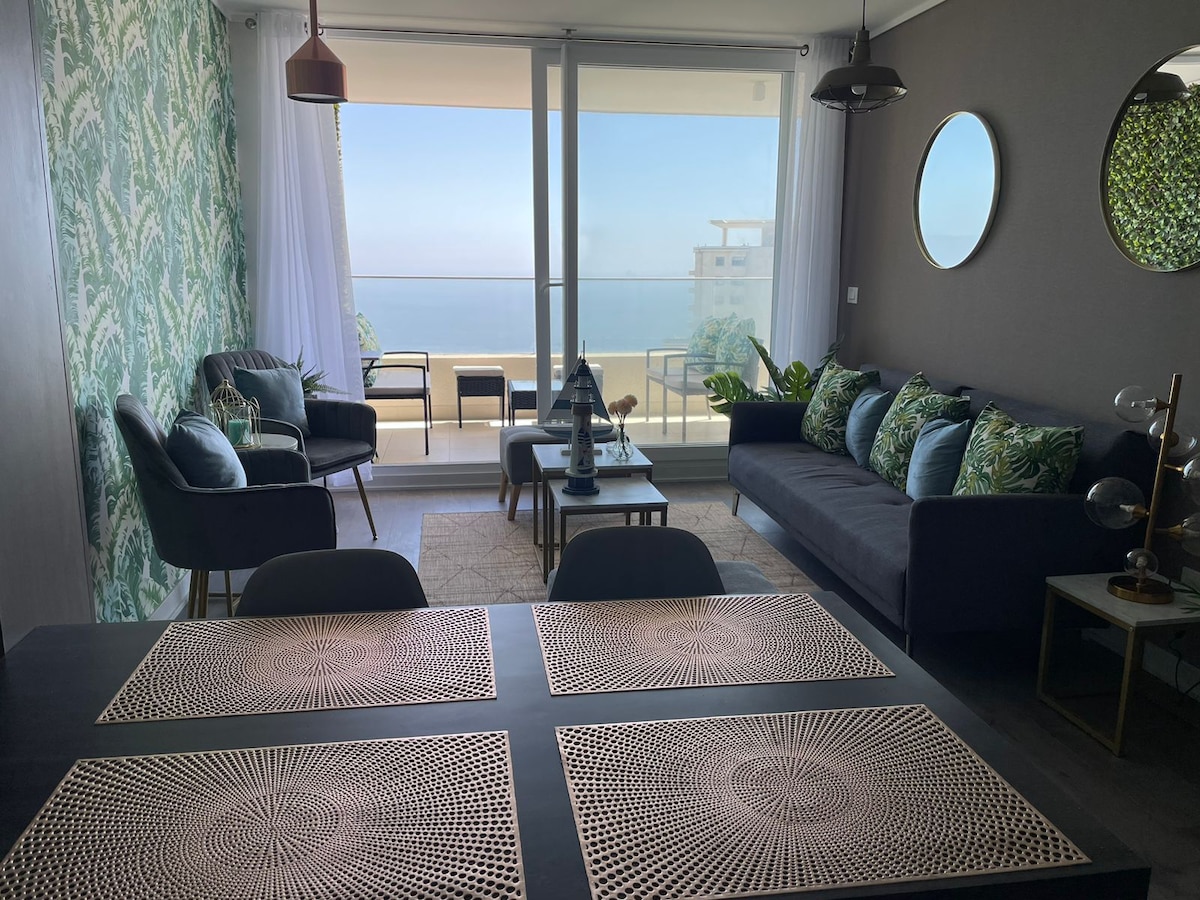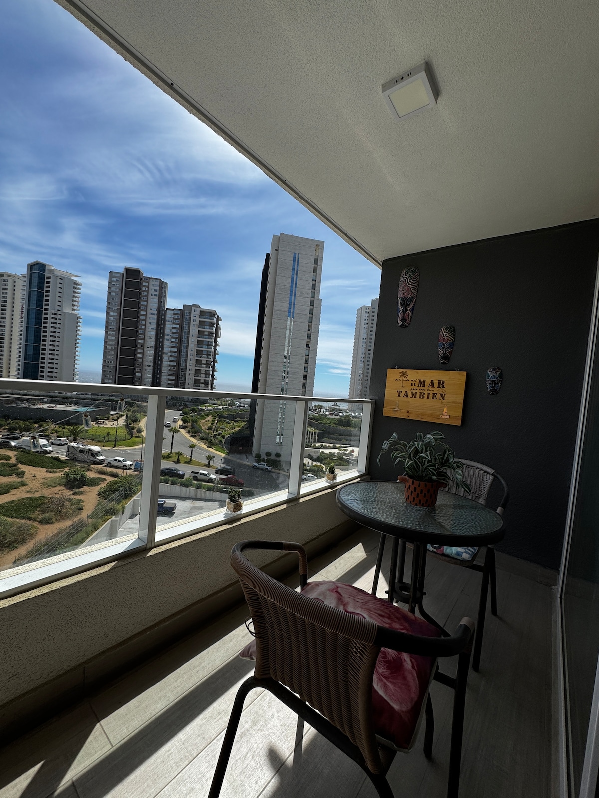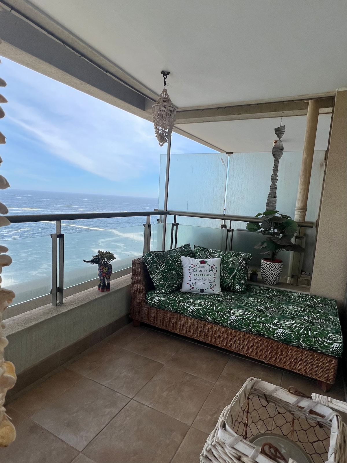 Lindo departamento con terraza vista al mar, un dormitorio un baño, completamente amoblado y equipado. Cuenta con wifi y cable para la tv smart de 42 pulgadas. Excelente iluminación. Edificio cuenta con consejería 24 hrs, 2 piscinas: exterior y temperada, gimnasio, sauna, quincho, lavandería y estacionamiento. Se encuentra cerca de supermercados, bencineras, farmacias. Ubicado a 5 minutos de la playa en auto, y 20 minutos a pie. Se ofrece descuento del 10% a estadías mayores a 7 días.