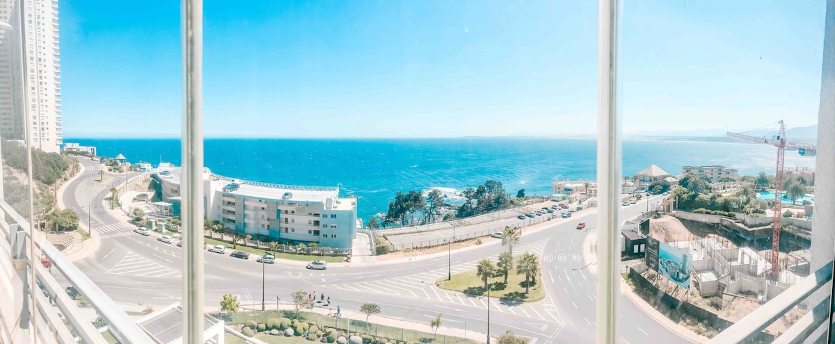 Departamento nuevo, moderno, equipado, de 2 ambientes y un balcón de 6 mts. lineales que mira los cerros de Valparaíso y el Océano Pacífico. Además cuenta con 2 piscinas hermosas de temporada y servicio de lavandería. Excelente ubicación y conectividad en transporte público electrico (Patrimonial) y cercano solo a 6 cuadras del terminal de buses.