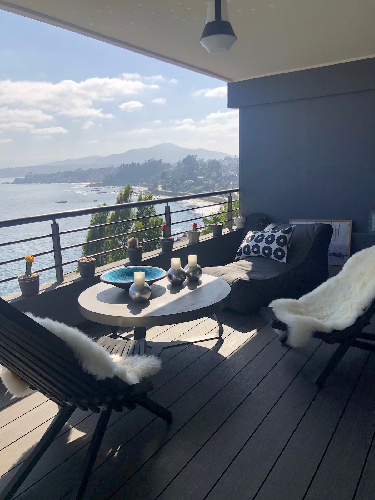 Wonderful apartment located in Costa Montemar (Concón) with an incredible and privileged view. Steps away from pharmacy, supermarket, and shops. Decorated, furnished, and equipped by professionals with high-quality furniture and details, for you to arrive and enjoy an excellent stay, ideally as a couple. It has private parking, wifi, and a smart TV. Equipped with a hairdryer, sheets, and towels.