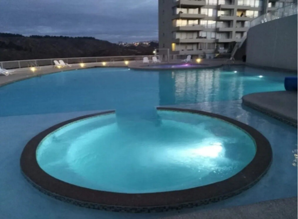 El departamento es moderno ubicado en un piso alto por lo cual tiene una espectacular vista. El transporte público esta a pasos de la calle principal 1 norte y camino troncal, centro de la ciudad, supermercados y Universidades. (U Federico Sta Maria & Sto Tomas). El barrio es tranquilo, ideal para parejas, con balcón y piscina privada. Depto sin calefacción. Distancias: ■ 15 - 20 minutos caminando aprox. de super JUMBO. ■ 15 min de la playa y casino en vehiculo. ■ Estacionamiento techado.