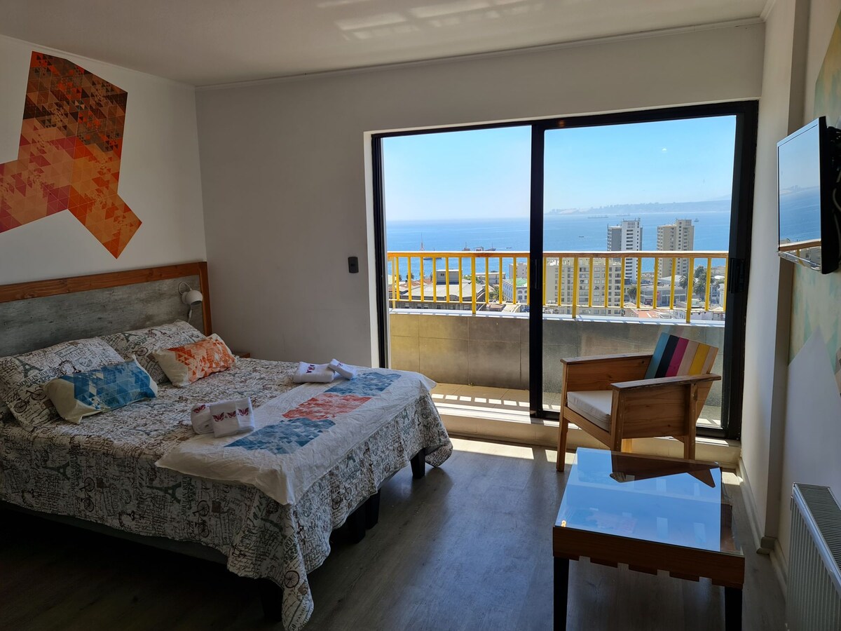Cómodo, acogedor, amplio y luminoso loft. Tiene terraza y vista parcial a la bahía. Está pensado para que la gente se relaje y pueda disfrutar con plenitud e intimidad del espacio. Ubicado a 100 metros del centro cívico de Valparaíso, donde hay comercio y locomoción de fácil acceso. Está a 10 minutos a pie del metro estación Bellavista, a 7 minutos caminando hacia los pies de Cerro Alegre y Concepción, y a 2 minutos caminando a los pies del Cerro Bellavista.