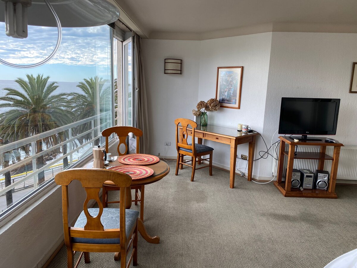 Lindo y elegante departamento amoblado con gran vista al mar, frente al Hotel Sheraton de Viña del Mar. Es muy luminoso y está a pasos del centro de viña, de la playa, del reloj de flores y de la av. Perú. Es ideal para una pareja (cama king) y tiene espacio suficiente para incorporar una cuna (no incluida). Desde el departamento, puedes caminar por el borde costero. Tiene 1 estacionamiento privado techado, cuenta con lavandería y piscina. Tiene conserjería dia y noche. Mínimo 2 noches
