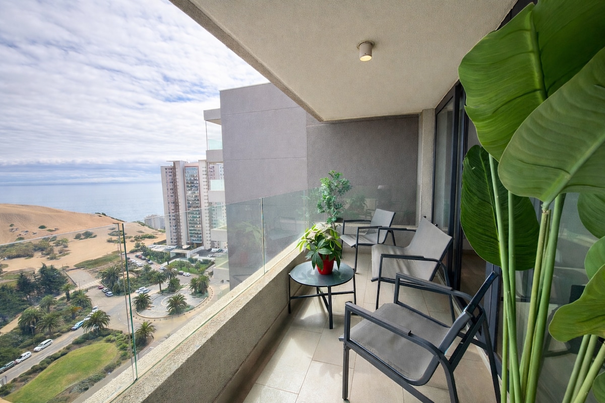 Moderno depto de 65 mts2 en el piso 22 en Costa de Montemar, tiene terraza con vista al mar panorámica. Dos habitaciones, una suite con cama 2 plazas y smart tv de 55’’ con tv cable y netflix y otra con dos camas 1 plaza. Dos baños full equipados con bañera. Cocina americana full equipada y lavadora. Estacionamiento.Parrilla. Wifi. A 2 km (15 min caminando) de la costa, playa los Lilenes, club de yates y dunas de arena. A 2,5 km del supermercado Jumbo, farmacias y locales comerciales.