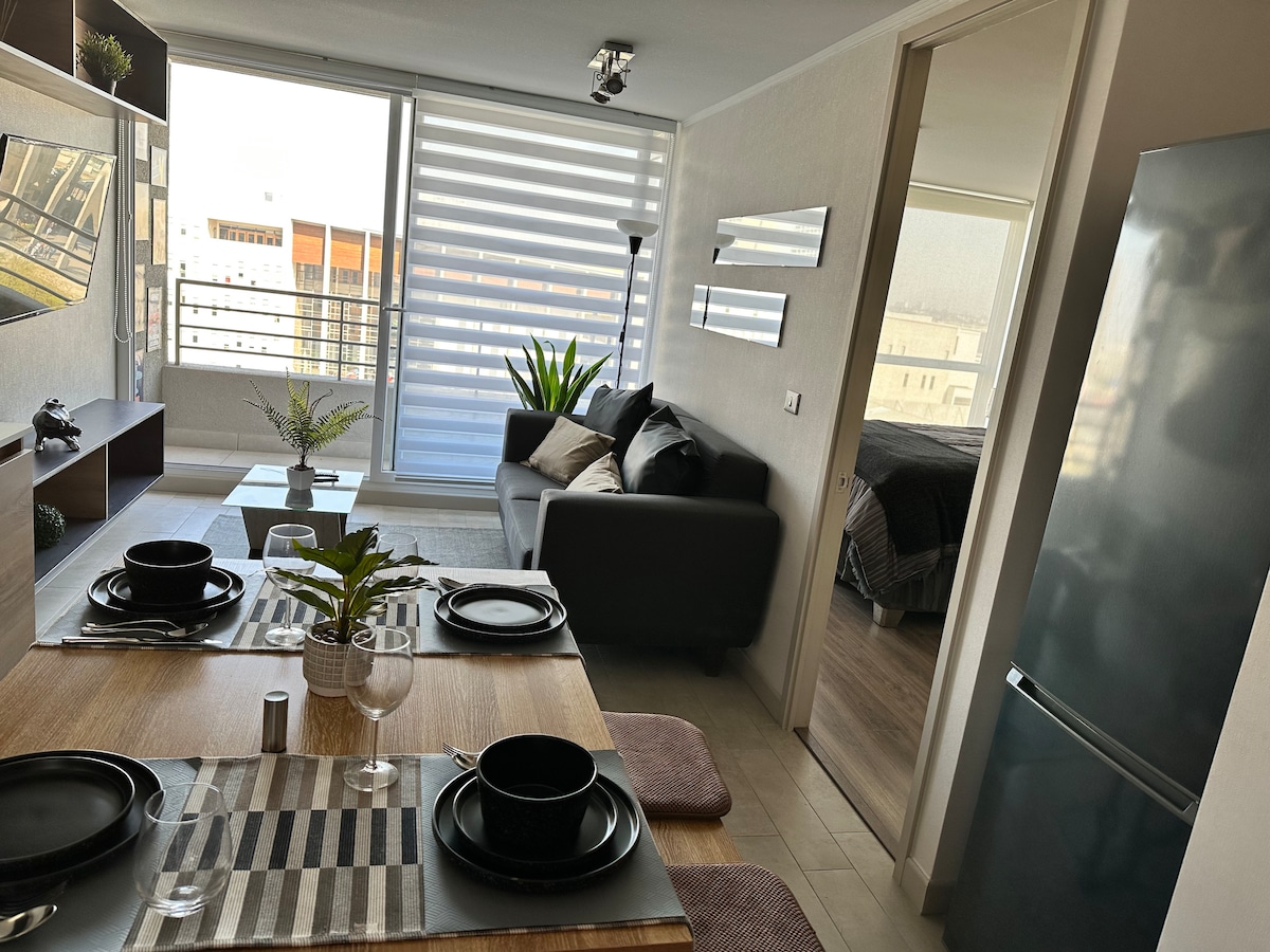 Excellent apartment, in a new building, thermopane windows and controlled access (24-hour concierge and electronic lock) Close to La Moneda, two blocks from the Parque Almagro Metro station (Line 3), three blocks from Toesca station (Line 2), and four blocks from La Moneda station (Line 1); in the tourist sector of Santiago. *Private parking (for one vehicle) *Full equipped (Android TV, washing machine, microwave, kettle, toaster, refrigerator, iron) *Wifi