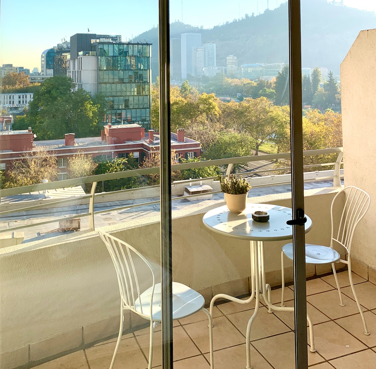 El departamento está en un noveno piso y tiene una vista privilegiada hacia el poniente, cuenta con una ubicación inmejorable en el corazón de Providencia, a pasos del centro comercial "Costanera Center", y a solo dos cuadras del Metro Los Leones. El lugar está rodeado de restaurantes, teatros, pubs, cafés, farmacias, librerías y salas de arte. Se ubica frente al Parque de las Esculturas, el que conecta con una ciclovía con el centro de Santiago a través del Parque Balmaceda y Forestal.
