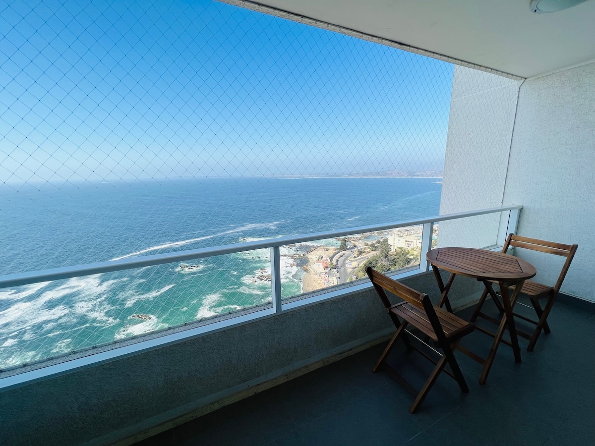 Departamento piso 11, vista al mar, Hotel Enjoy y casino, Internet Alta Velocidad, en pleno corazón de Viña, a pasos de avenida Perú y San Martín. Zona de Restaurantes y comercio. Cómoda terraza excelente vista. Totalmente equipado y finamente decorado. Living con cocina integrada y sofá cama. Habitación en suite con cama de 2 plazas. Edificio con piscina climatizada y gimnasio. Estacionamiento subterráneo propio del depto. Capacidad 2 adultos o un adulto y un menor.