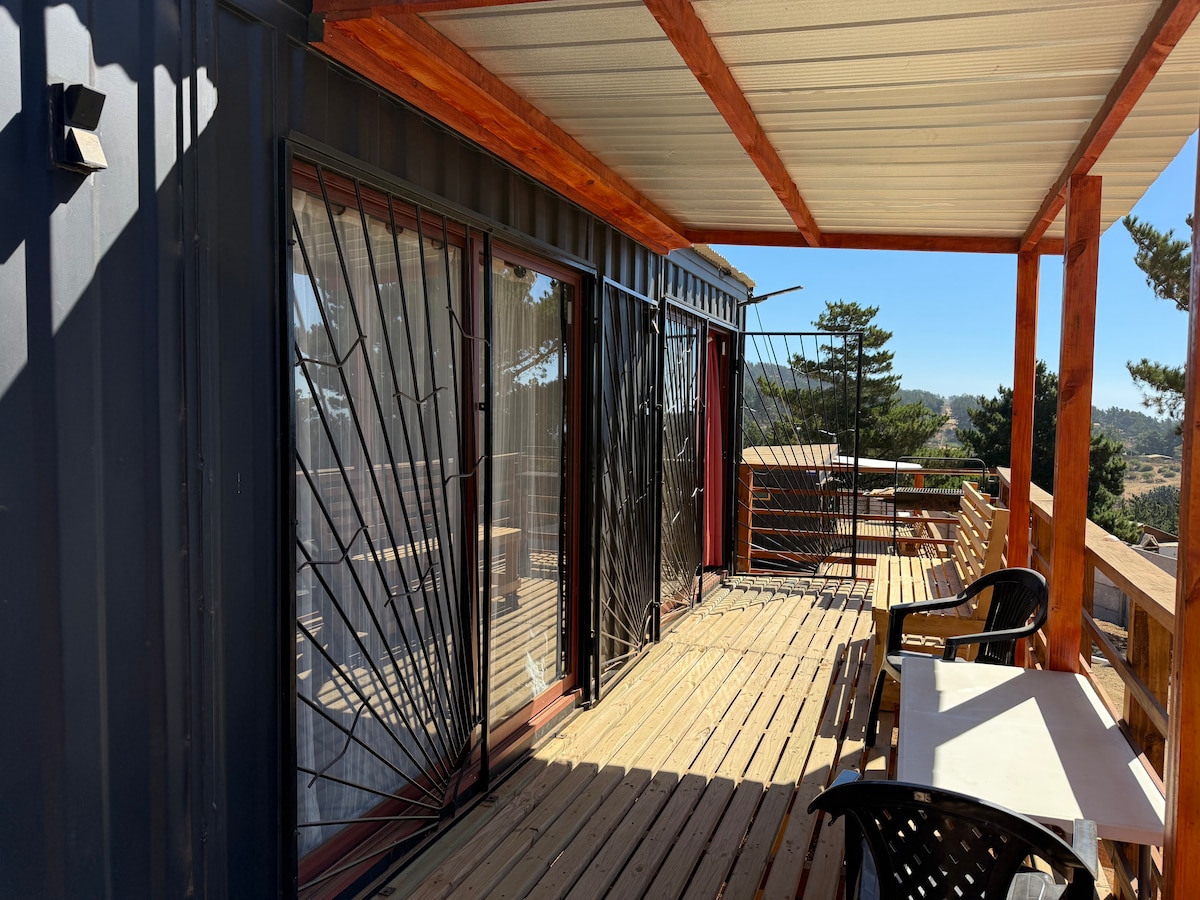 Ven a disfrutar de nuestra encantadora cabaña container en un entorno romántico rodeado de naturaleza. Nuestro espacio está diseñado pensando en una grata estadía. La cabaña tiene aislación térmica en base a poliuretano y en dormitorio ventanal termopanel, en la zona exterior posee una agradable terraza deck, una mini piscina, asadera, hamaca, ducha al aire libre y estacionamiento privado en el acceso. Todas estas instalaciones son de uso exclusivo de los huéspedes de la cabaña.