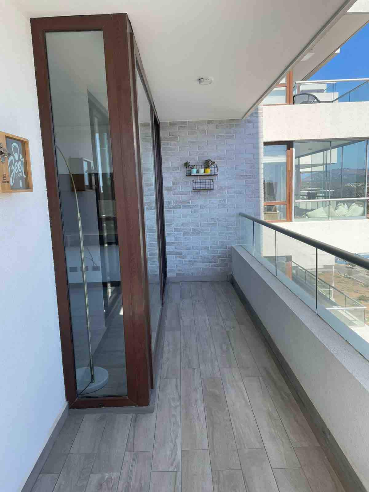 Lindo departamento con terraza vista al mar, un dormitorio un baño, completamente amoblado y equipado. Cuenta con wifi y cable para la tv smart de 42 pulgadas. Excelente iluminación. Edificio cuenta con consejería 24 hrs, 2 piscinas: exterior y temperada, gimnasio, sauna, quincho, lavandería y estacionamiento. Se encuentra cerca de supermercados, bencineras, farmacias. Ubicado a 5 minutos de la playa en auto, y 20 minutos a pie. Se ofrece descuento del 10% a estadías mayores a 7 días.