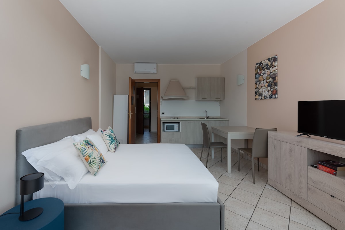 Finemente arredato in stile moderno con materiali garantiti bio, dalle pavimentazioni ai tessili, dispone di una camera matrimoniale, zona giorno con divano letto e cucina, servizi. Aria condizionata e riscaldamento, WiFi, TV sat, posto auto privato, piccolo giardino privato e veranda. Non c’è porta nella camera da letto Il Loft Standard fa parte del Lamasu Wellness&Resort, residence composto da 11 appartamenti