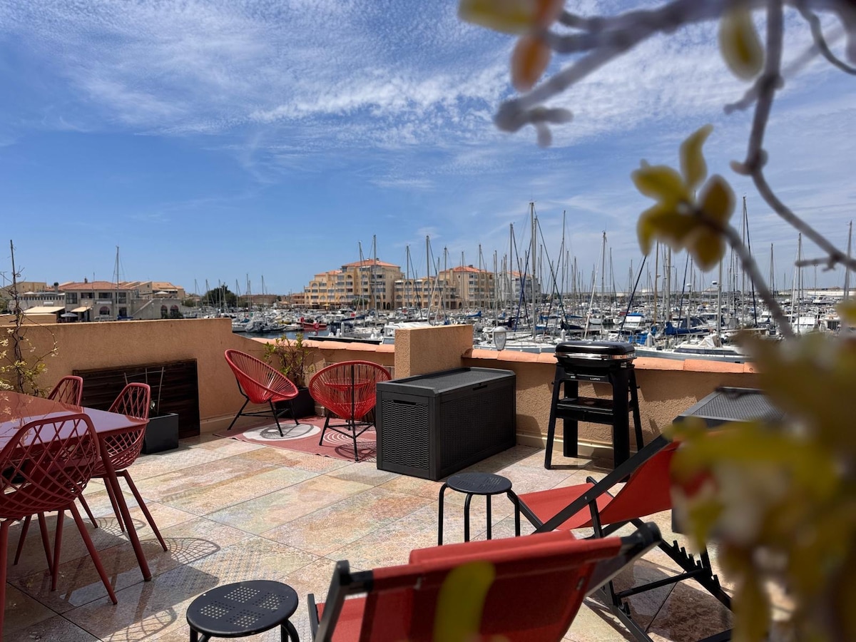 Appartement atypique, entièrement refait. Au sein d'un ancien chais reconverti en résidence, vous accédez à l'appartement en traversant un patio ombragé. Sous les toits, cet appartement plein de charme avec charpente apparente est équipé d'une climatisation réversible. Vous pourrez profiter de sa terrasse exposée plein Sud et d'un accès direct sur le port. La cuisine est très bien équipée, TV et wifi à votre disposition. Lit en 160 grand confort dans une chambre indépendante climatisée.