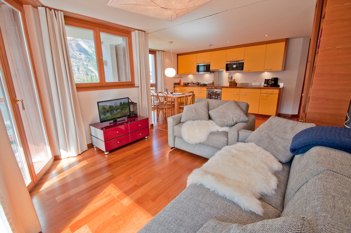 Gemütliches 2-Raum-Appartement mit großem Südbalkon mit schönem Blick ins Zermatter Tal und zum Kleinen Matterhorn. Mit dem Zermatt-Shuttle nach Zermatt. Direkt vom Haus in 5 min. zum Golfplatz, See. Innenschwimmbad, Fitness, Tennis, Garage, Lift. Der Wellnessbereich ist von Anfang August 2025 bis Herbst 2026 wegen Renovierungsarbeiten geschlossen! Im Winter hält der Zug nach Zermatt und ins Skigebiet direkt an der Apartmentanlage. Du kommst so sehr bequem direkt ins Skigebiet von Zermatt.