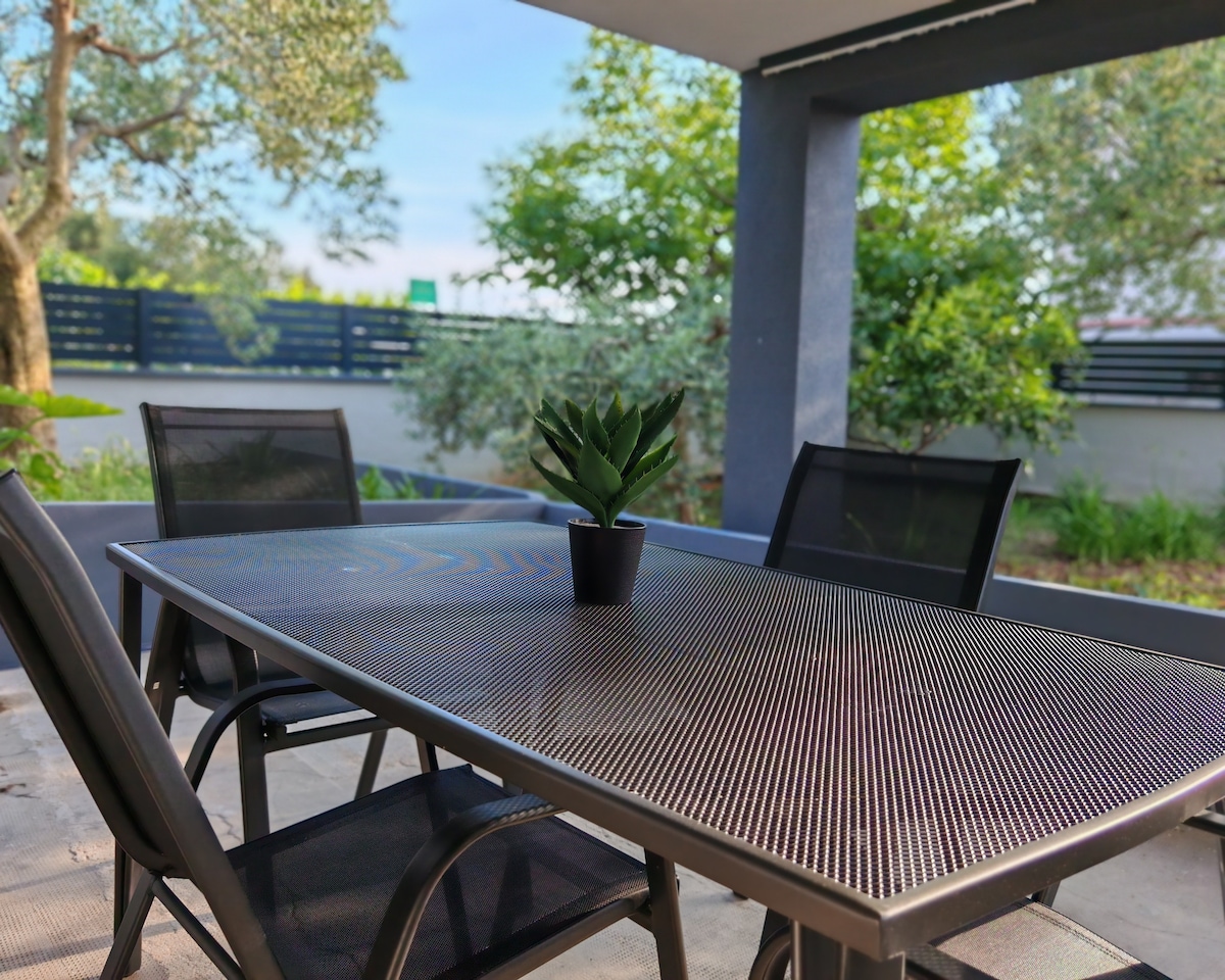 Villa "Qube n' Qube" with heated pool (extra 30.- per day), 4 ensuite bedrooms, and stylish open-plan living area. Located in peaceful Loborika, just 6 km from Pula and 8 km from the sea. Enjoy a private fenced garden with a terrace, BBQ, and kids’ playground. Fully equipped kitchen, A/C throughout, and smart TVs in every room. Perfect for a relaxing Istrian getaway!