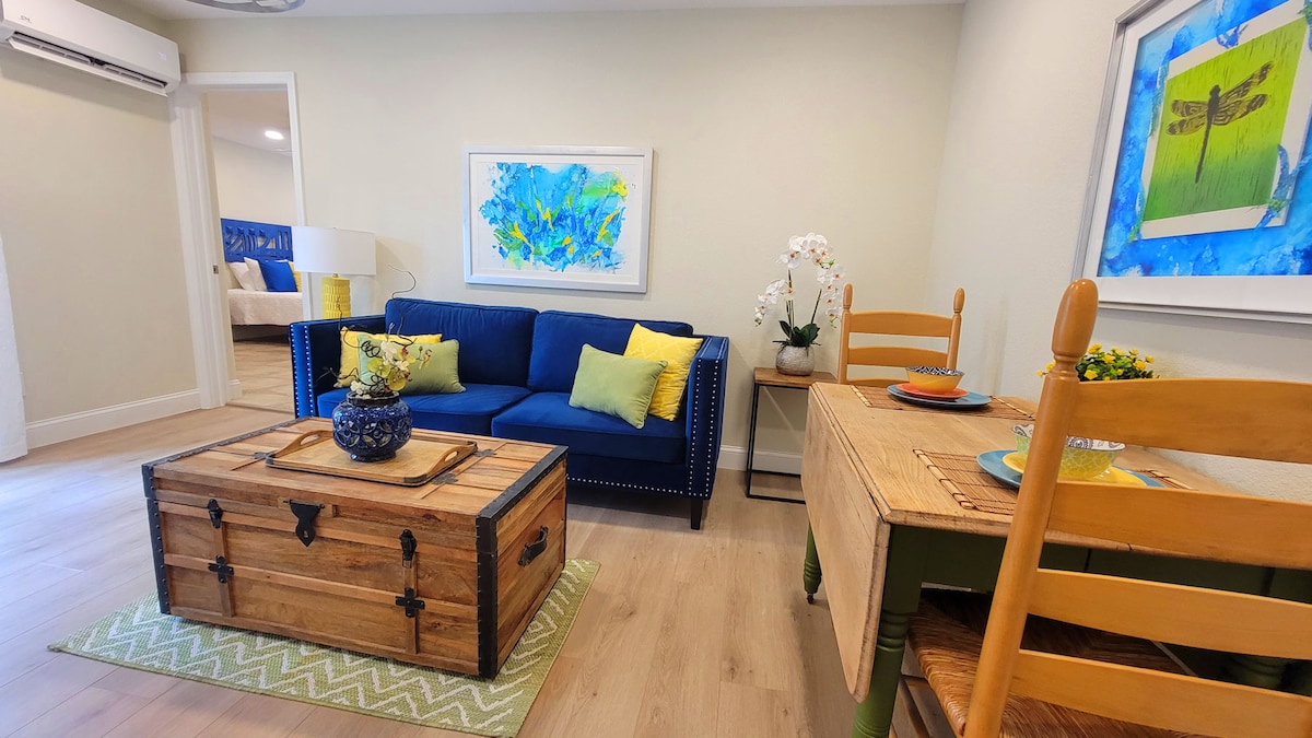 Discover the charm of Sarasota in our newly remodeled 2BR/1BA vacation home. Just 1.6 miles from beautiful Siesta Key Beach! Enjoy your morning coffee on a brick patio surrounded by flowers and sunshine. Our comfy beds, blackout curtains, and quiet neighborhood ensure a sweet deep sleep. FIOS wifi and three smart TVs; a fully-equipped kitchen; and a sparkling new bathroom with two sinks, huge mirror, and marble shower offer all the comforts and convenience of home. We welcome you!