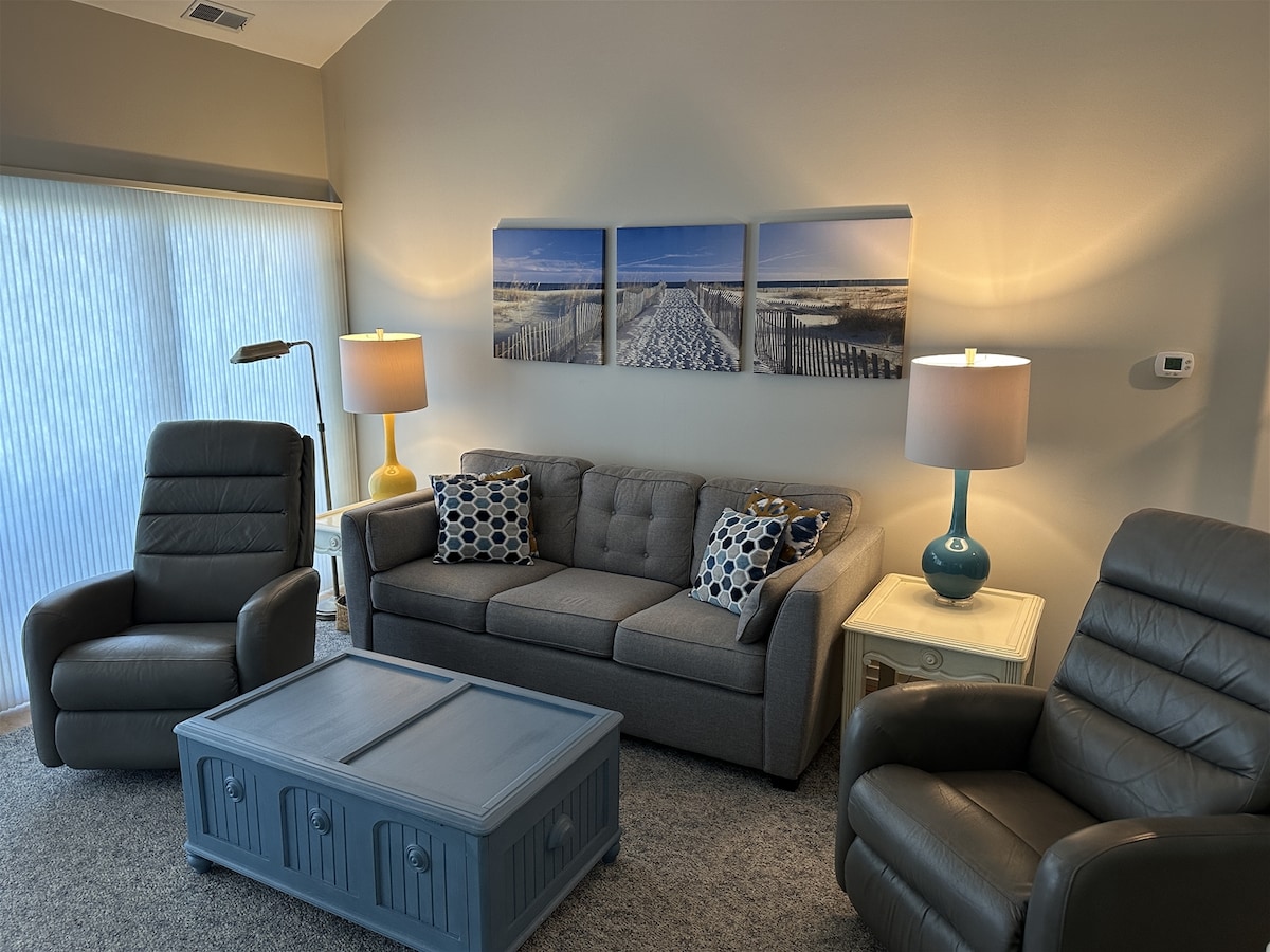 Summer in October! The Beach House is a first floor, step free condo 7 houses from Newcome Beach; just two blocks from sandy beaches and gorgeous sunsets! Master bedroom w/new King sized bed, new carpet, walk in closet, and private bath with new ADA low barrier handicapped shower. Amazing water pressure! The 2nd bedroom has XL twin beds, (new mattresses) and bathroom with shower off the hall. New sofa bed in LR. Private patio with new 6 burner grill. We are on the "beach side" of town.