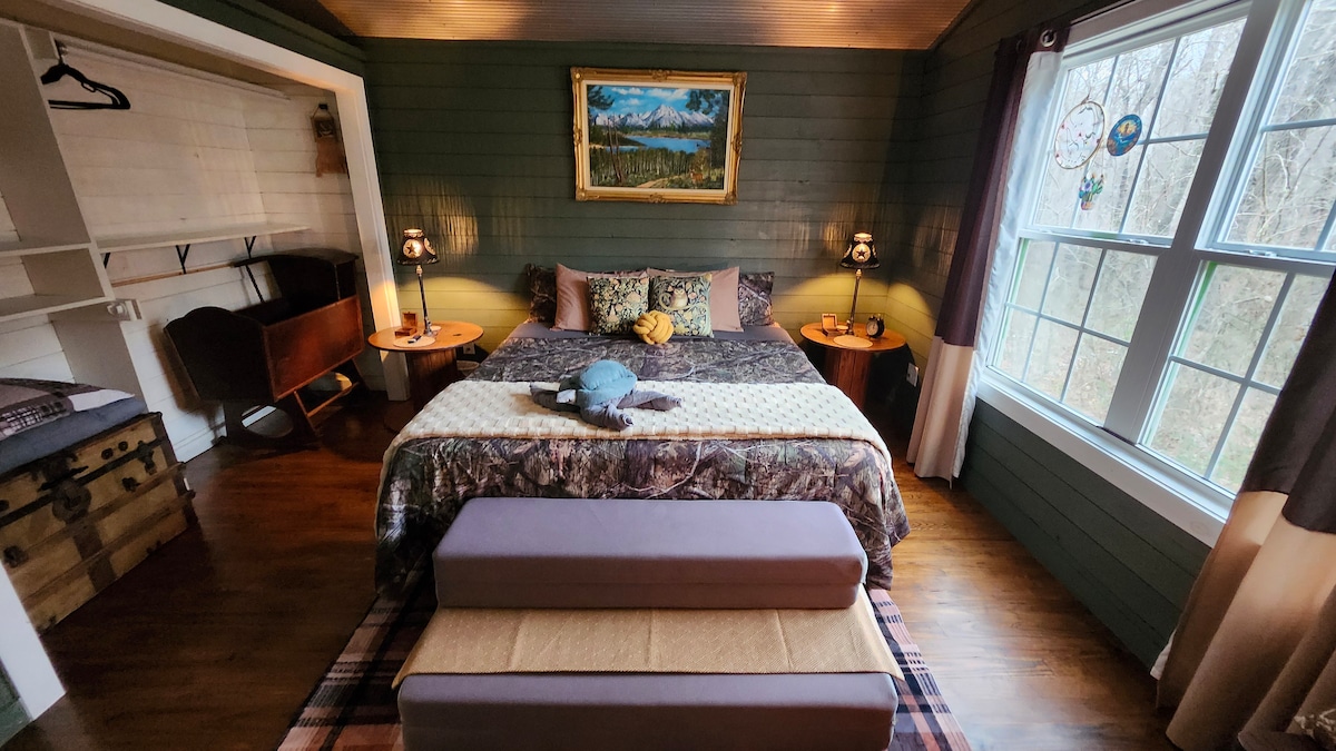 ● Rustic Cozy 1-bed/1-bath cottage with private trail ● Private entrance, private parking . Guest house is behind the main house , host live on site but full privacy is guaranteed. back porch, firepit and backyard is all for guests only. ●10 minutes from the fall creek fall ENTRANCE ● WiFi + 2 smart TVs ● 2 split type Heat and Air conditioning ● Perfect for solo travelers or couples (up to 4 guests) who want a quiet, rustic, artsy getaway
