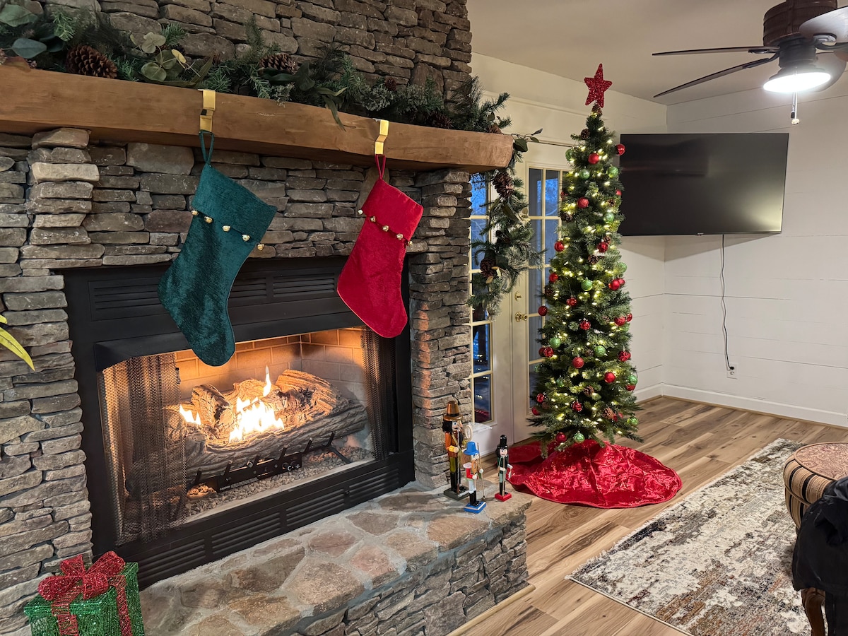 Newly built cabin on the Caney Fork River bank featuring a master bedroom w/ king size bed & private bath. A second bedroom offers a queen size bed with direct access to bathroom, two full over queen bunk beds upstairs. Large front porch & spacious yard w/ corn hole, charcoal grill, fire pit & hot tub are waiting for you. Gas fireplace, comfortable furniture, fully stocked laundry, & well equipped kitchen, high speed fiber internet, smart TVs, books, puzzles, and games make your stay more fun.