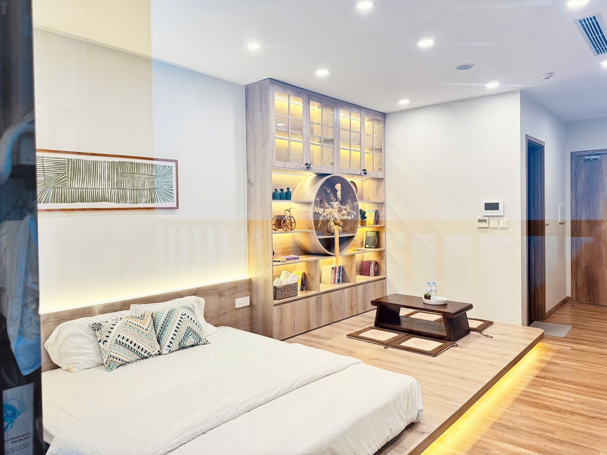 Styled in Modern European–Calm Beige tones, the space features warm wood interiors, soft lighting and an open-plan living area that feels both elegant and relaxing. • An intimate calm beige retreat with a private bathtub and serene Swan Lake views. • Quiet luxury, total privacy-your peaceful escape in Ecopark. Ideal for couples, families, expats or long stays who value quiet luxury and privacy.