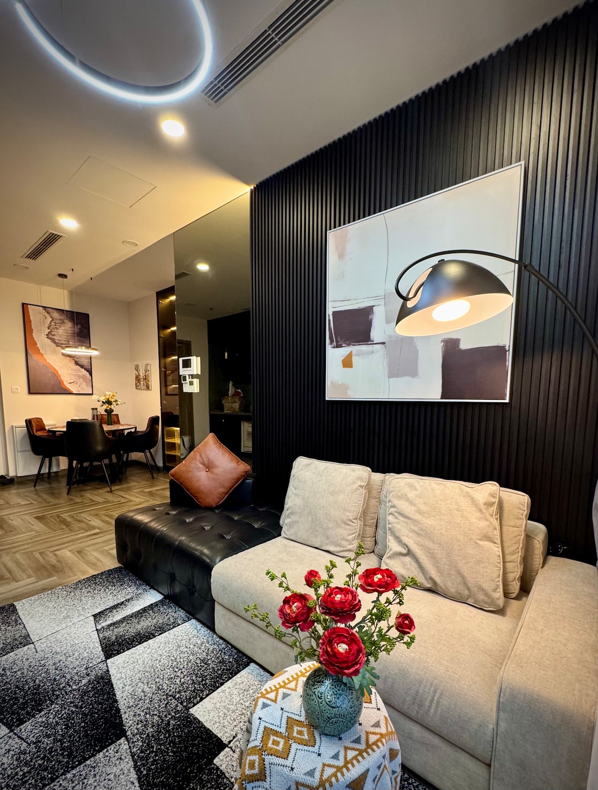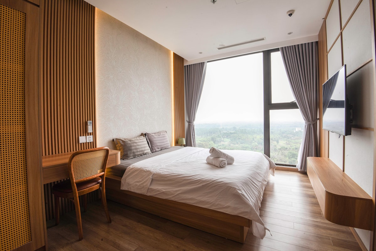 A high-floor garden apartment on the 24th floor, designed for guests who value privacy and quiet luxury. Featuring a rare private garden with open views of Ecopark’s island villas. Calm, elegant, and refined — ideal for couples, creatives, and discerning travelers seeking a boutique living experience rather than mass tourism. ~~~~~ Căn hộ tầng 24 có sân vườn riêng hiếm có, view biệt thự đảo Ecopark. Không gian yên tĩnh, tinh tế, dành cho khách có gu và trân trọng trải nghiệm sống cao cấp.