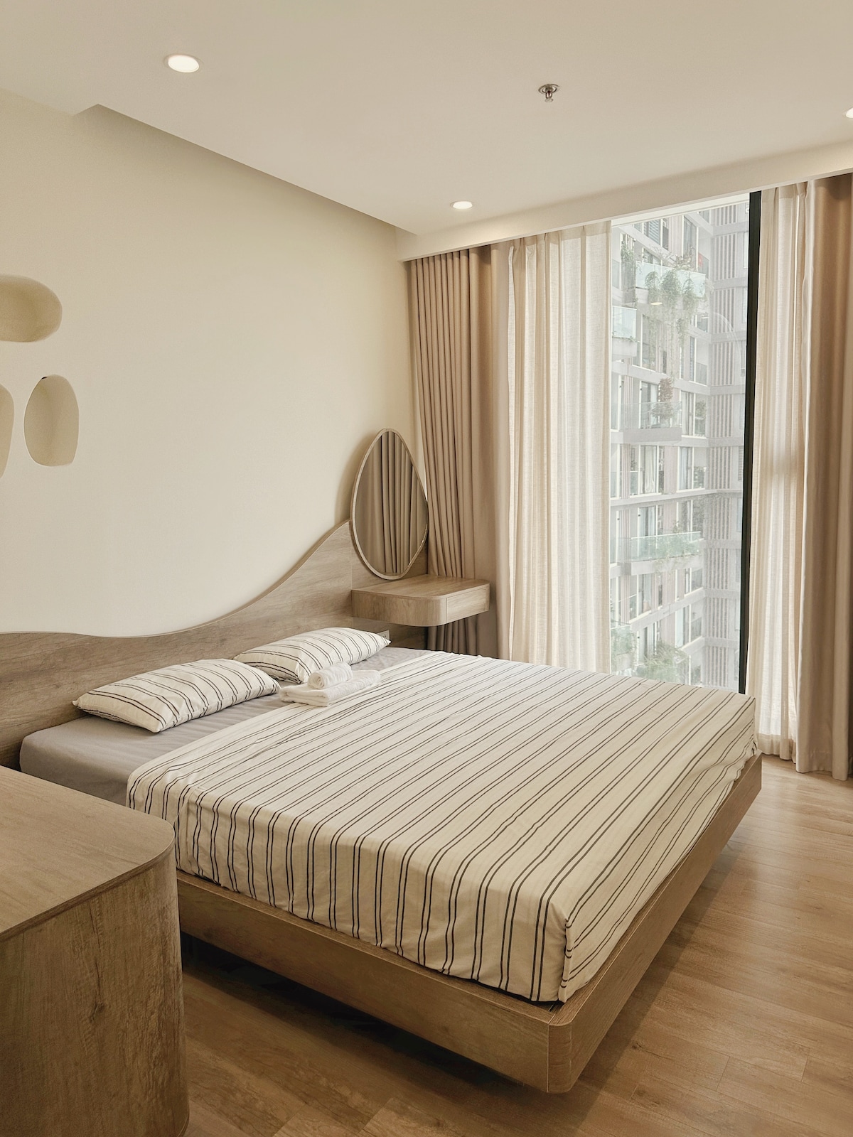 Căn hộ có 2 phòng ngủ, 2 vệ sinh, bồn tắm, phòng tắm kính, ban công nhìn ra hồ và công viên. 2 giường đôi: 1,8m và 1,6m, bàn làm việc Căn hộ thiết kế thân thiện với môi trường, tiện nghi cho người ở, nhiều ánh sáng tự nhiên Internet tốc độ 150 Mbps Máy giặt, máy sấy quần áo, máy lọc không khí Bếp đủ đồ nấu ăn, lò vi sóng, lò nướng, tủ lạnh View hồ, công viên, sân golf, bể bơi Cách trung tâm Hà Nội 30-40', sân bay 45' Bến xe bus 100m bus 69 Thuận tiện đi các tỉnh phía Bắc Vietnam.