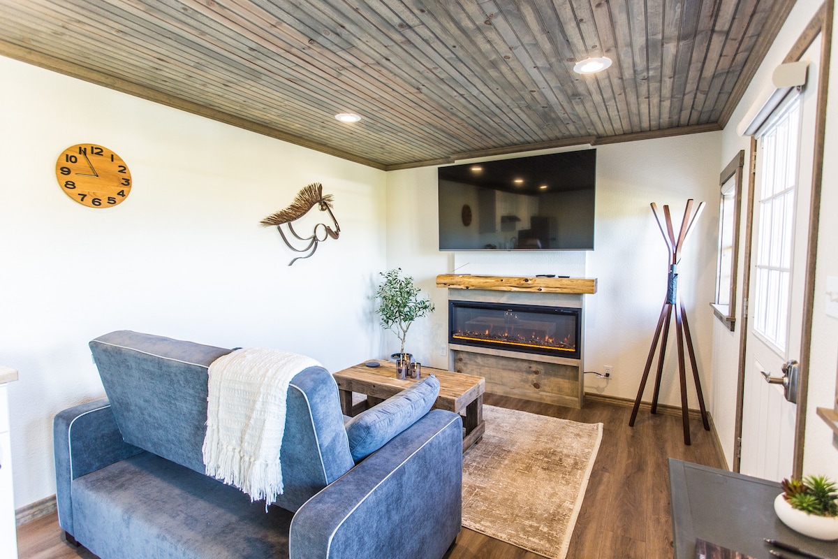 Rest and relax with Rosie (mini horse) and her mini friends (including 2 miniature Highland cows) in our cozy cabin on our 20-acre horse ranch. Wi-Fi, 2 smart TV's, washer/dryer, queen bed, twin bed and XL bean bag that folds out into a king floor bed are all provided. Enjoy the fully equipped kitchen with a full-size fridge, stove, oven and microwave. Use the gas grill on the covered front porch that looks out onto Rosie's pasture. Bring your fishing poles to catch some fish in the pond.