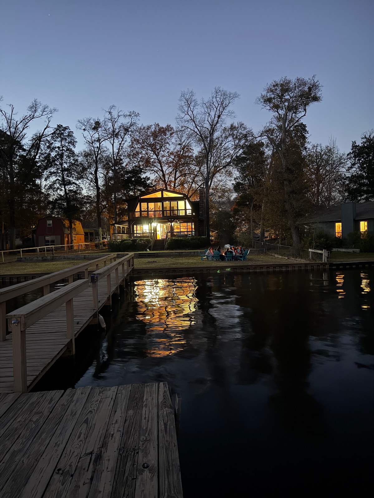 Exquisite 4 bed 2 bath home on 2+acres of scenic Lake Holbrook w/ 210’ of shoreline. Huge Front Porch w/ rocking chairs, fans, lights, dining table. Sleeps 14 w/open concept living w/ gas fireplace & modern kitchen w/ black stainless appliances & reclaimed glass counters. Board games, PPong,Hammocks, kayaks, paddlboards,canoe, fire pit, fishing pier all available for your stay. Sand Beach entry & great fishing . Hammocks in the shade, basketball goal & brand new covered pier with fishing dock!