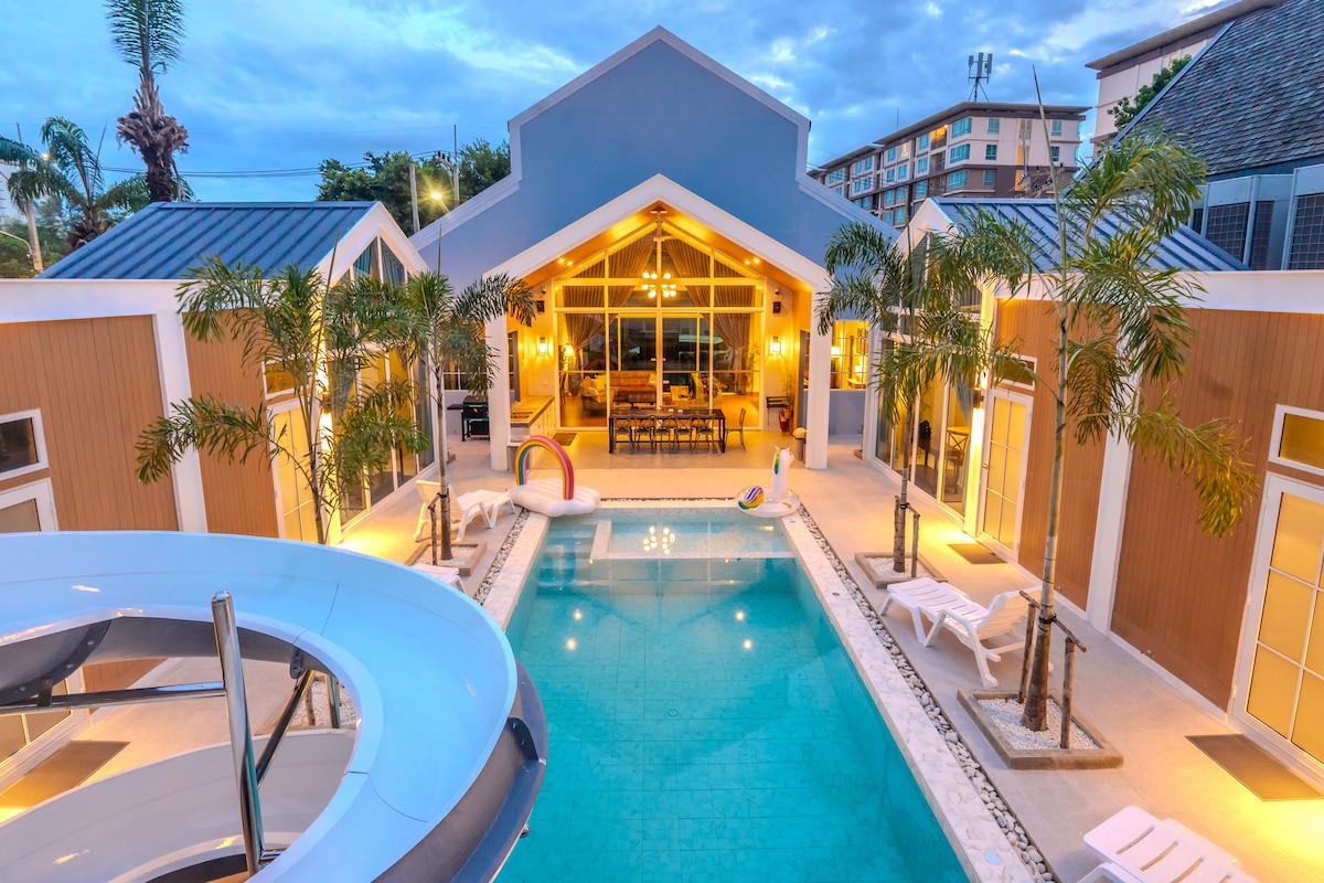 9 Rooms pool villa located near Hua Hin night market. Only 1 kilometers away from famous street walking of Hua Hin, you will enjoy the vibration of the city everyday. The villa offers spacious area for all activities, with 400 square meters. The swimming pool size is 5*15 meters with 15 meters ling water slider with wide balcony and entertainment facilities. The place is perfect for all occasion parties.