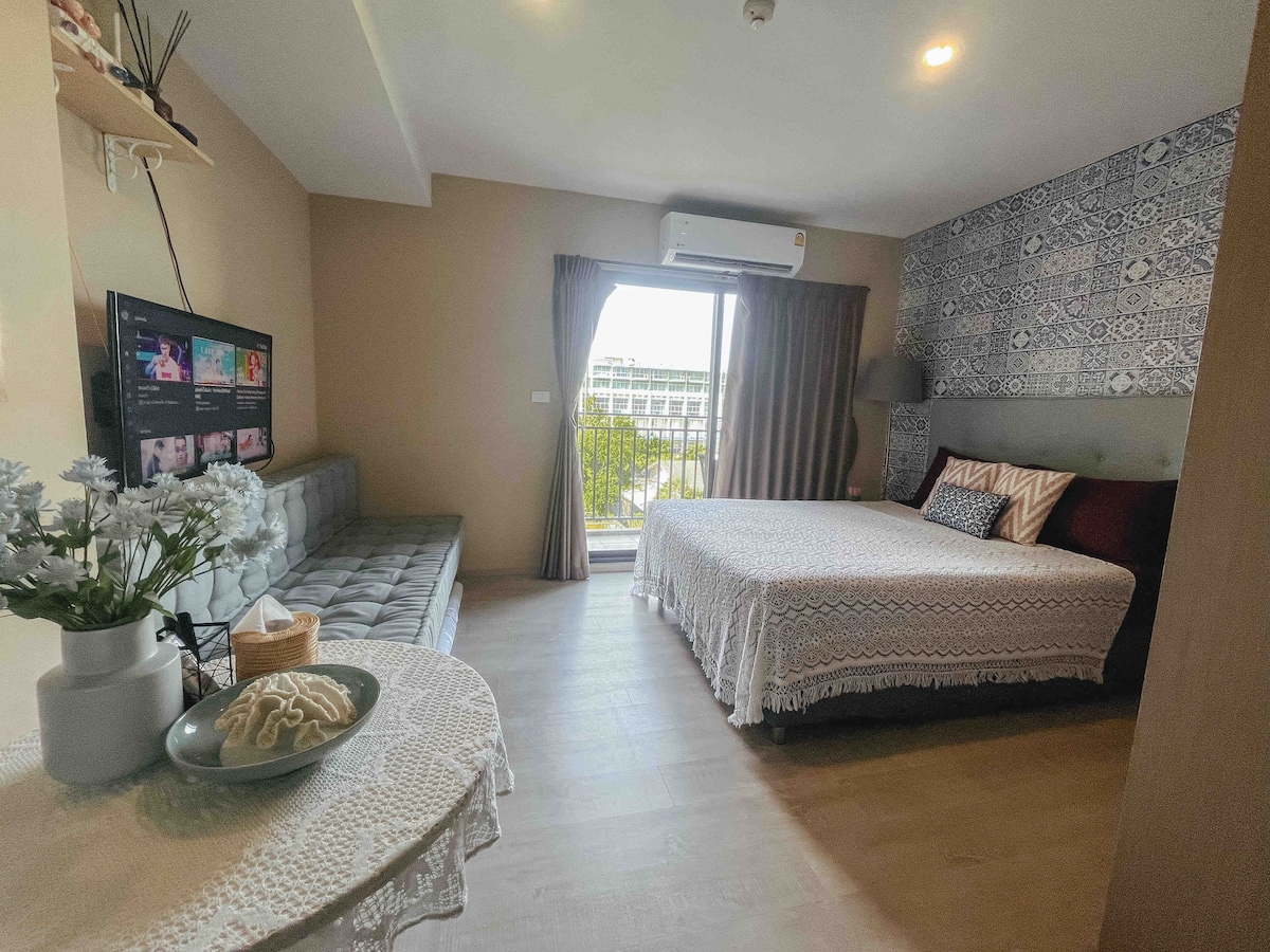 The room is on the seventh floor and on the north side of the building. Your front is the sea and your back is the mountains Below the building, there are coffee shops and cafes for children. Room Size : 47.5 sq m Bed Size : King Size for 2 people Price : 2000฿/night for weekdays 2300฿/night for weekends ( We don't have breakfast service ) We have a balcony table for enjoying the view