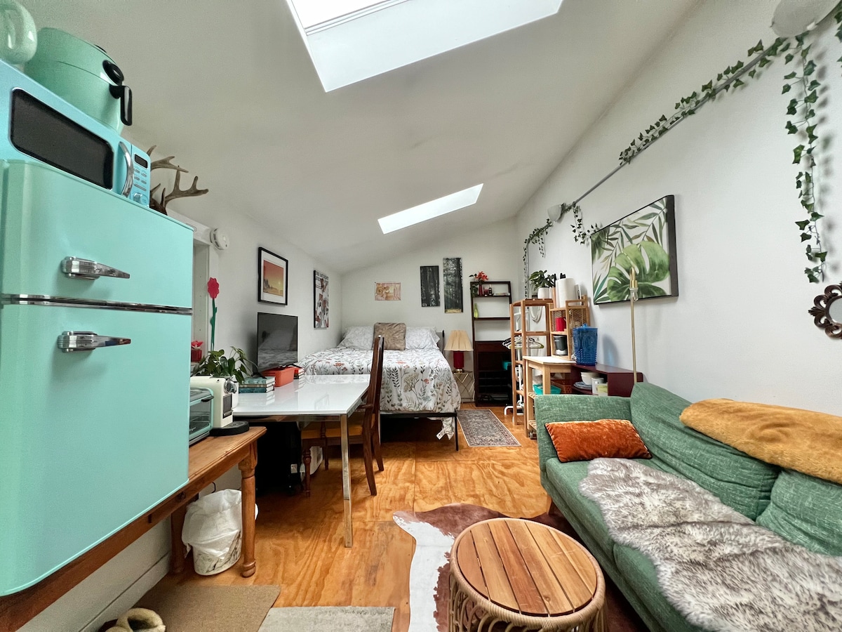 My little B&B operation has everything you need for a cozy, private stay in a stylish studio with your own ground level access. The high ceilings, skylights & wood floors compliment the room, giving it an airy feel. The adorable kitchenette appliances supplement the myriad of fabulous restaurants right outside your door step. Complete with microwave, kettle, air fryer, AC ,Wifi, smart TV, books, coffee & tea. Location is amazing with bus transit, parks, beach & shopping an easy walk away.