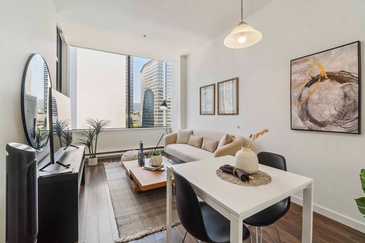 Stay in a bohemian style apartment that's incredibly close to Downtown Vancouver. This stunning 1-bedroom apartment is the perfect base for exploring the city's rich history and cultural landmarks. The apartment features a bright Queen-sized bedroom, a fully equipped modern kitchen, and a cozy living room with a large sofa bed for a restful sleep. Enjoy all the amenities you need for a comfortable stay in Vancouver!!