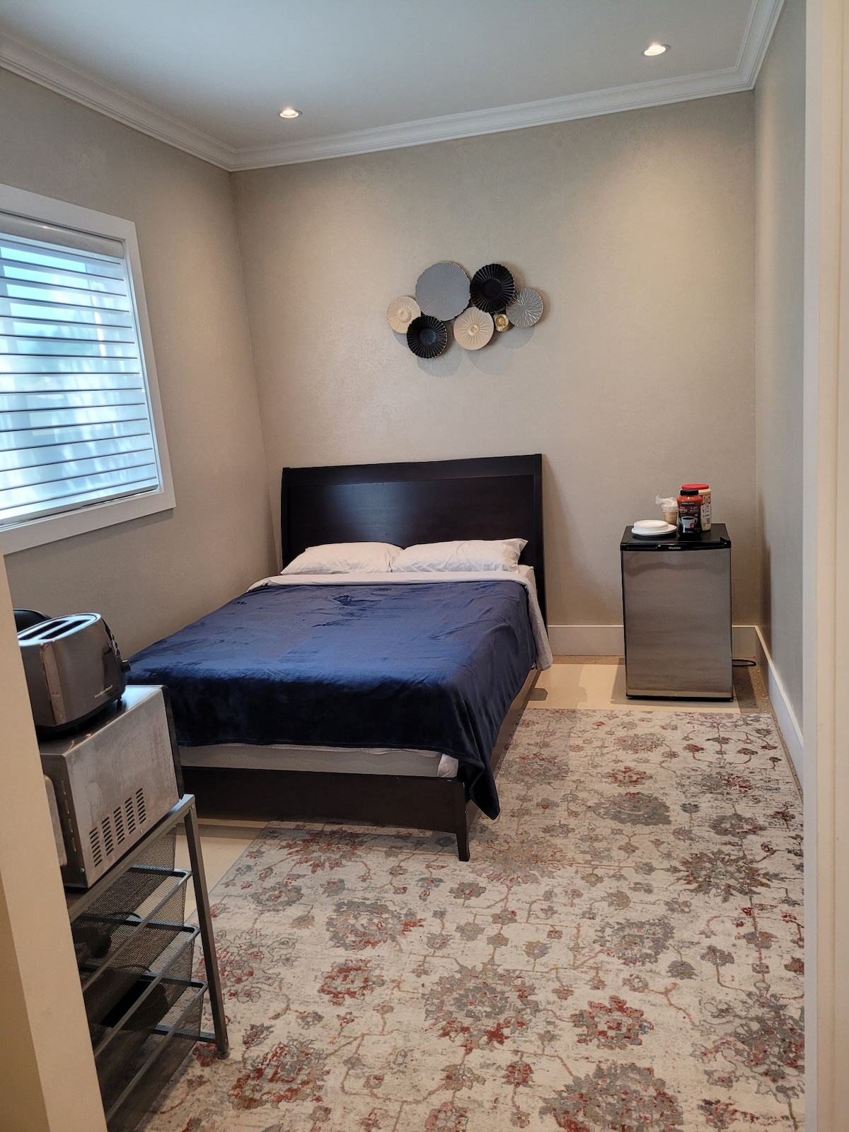 Enjoy a private, self-contained room with its own entrance, full bathroom, and closet in a central, safe, and family-friendly neighborhood. Perfect for up to two guests, the space includes a comfortable queen-size bed, mini-fridge, microwave, toaster, electric kettle, TV, and reliable Wi-Fi — everything you need for a relaxed stay. Street parking is available.