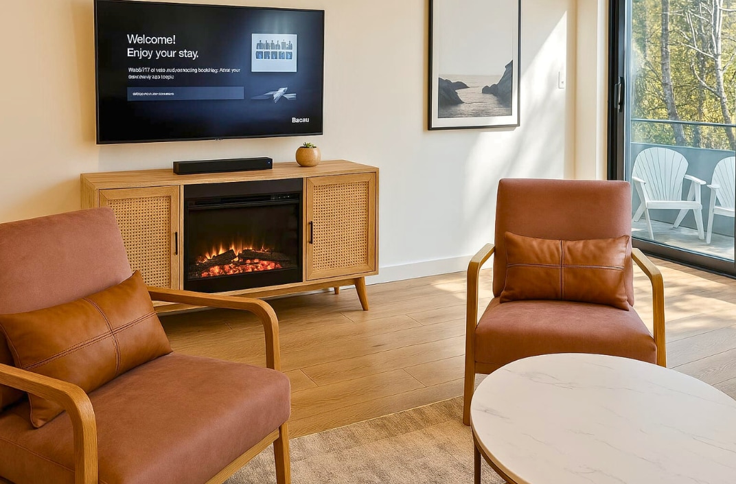 Our suite is a stunning, newly built one-bedroom retreat, featuring a 9’ ceiling and a generous 810 SF space. It features a 58" smart TV, and a fully equipped kitchen, ensuring a high-quality lifestyle during your travels. Revel in the breathtaking sunrise and sunset from your private balcony, with a magnificent view of the ocean and mountains across the Georgia Strait. Conveniently located, our suite is an ideal base to discover Vancouver Island’s allure.