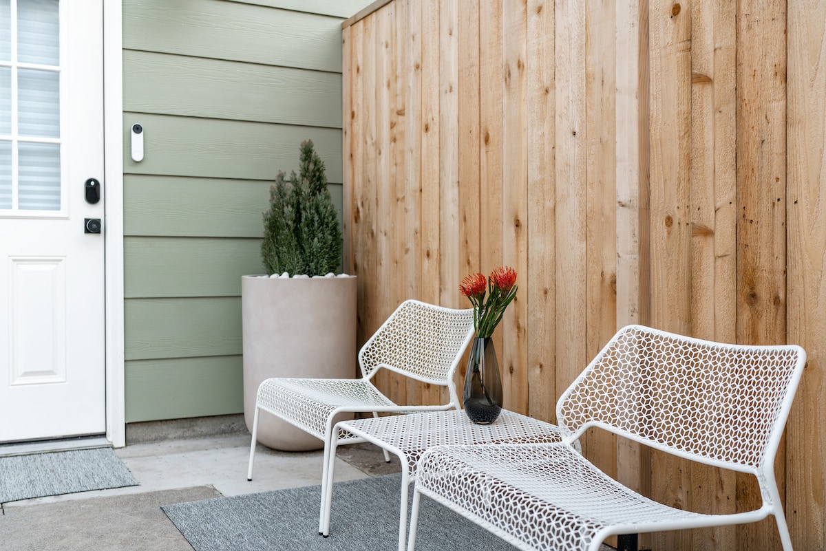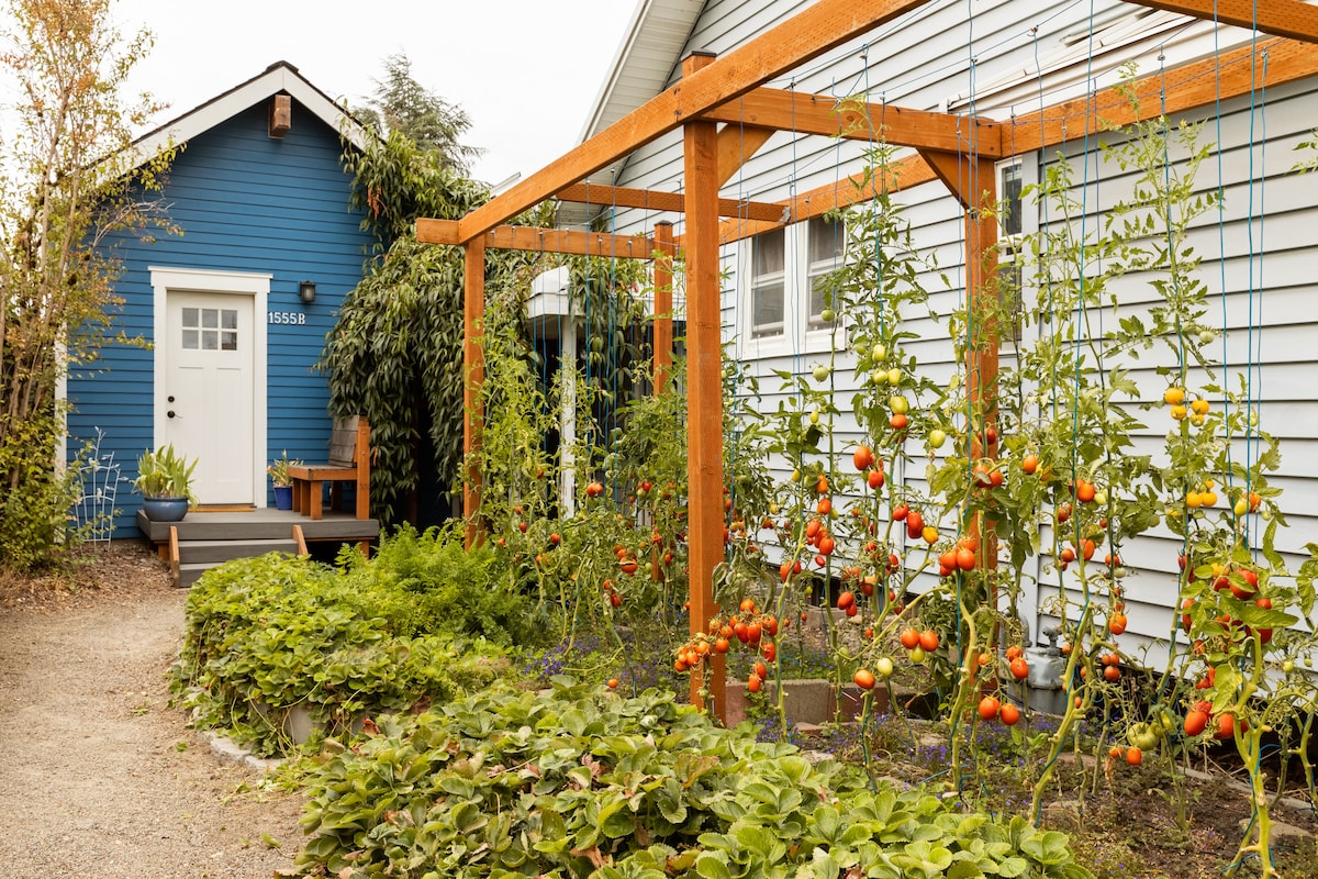 Private cottage with views of the garden. High ceilings, lots of natural light and warm accents. Stocked kitchenette. Four, friendly cats waiting to visit in the garden and three, suspicious, but friendly, hens in the chicken coop. Tranquil garden with fruit tees, flowers, bubbling fountain, chimes, and sheltered, cozy seating. Nearby food, drink, shopping and recreation options. Local recommendations. Your home away from home! Ask about renting our 2023 Toyota Sienna, hybrid minivan.