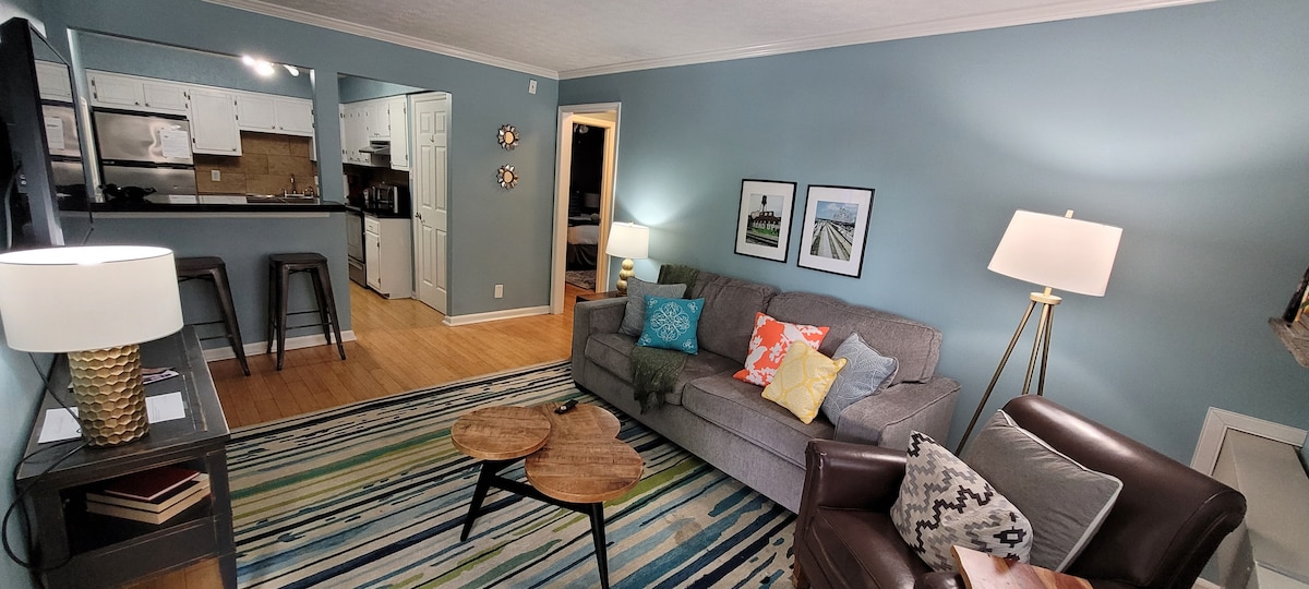 This professionally designed studio is minutes from Nashville’s top venues and just 2 miles from Broadway - perfect for concert nights and couples’ getaways. Guests often say this is one of the cleanest stays they’ve experienced, with thoughtful details that make it especially comfortable. Enjoy reserved parking, easy self check-in, a fully stocked coffee station, high-end finishes, a spacious walk-in shower, and a comfortable home base close to it all.