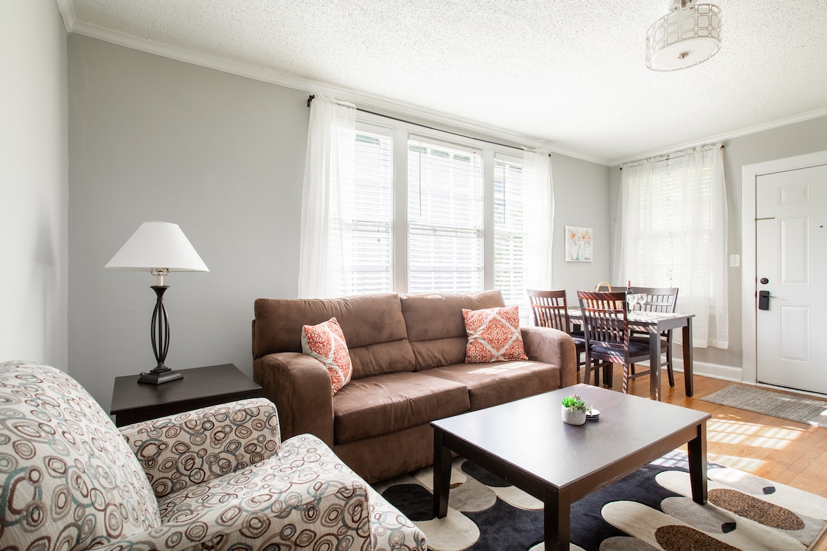 This professionally designed studio is minutes from Nashville’s top venues and just 2 miles from the Broadway - perfect for concert nights and couples’ getaways. Guests often say this is one of the cleanest stays they’ve experienced. Enjoy reserved parking, easy self check-in, a fully stocked coffee station, high-end finishes, a spacious walk-in shower, and a comfortable home base close to it all.