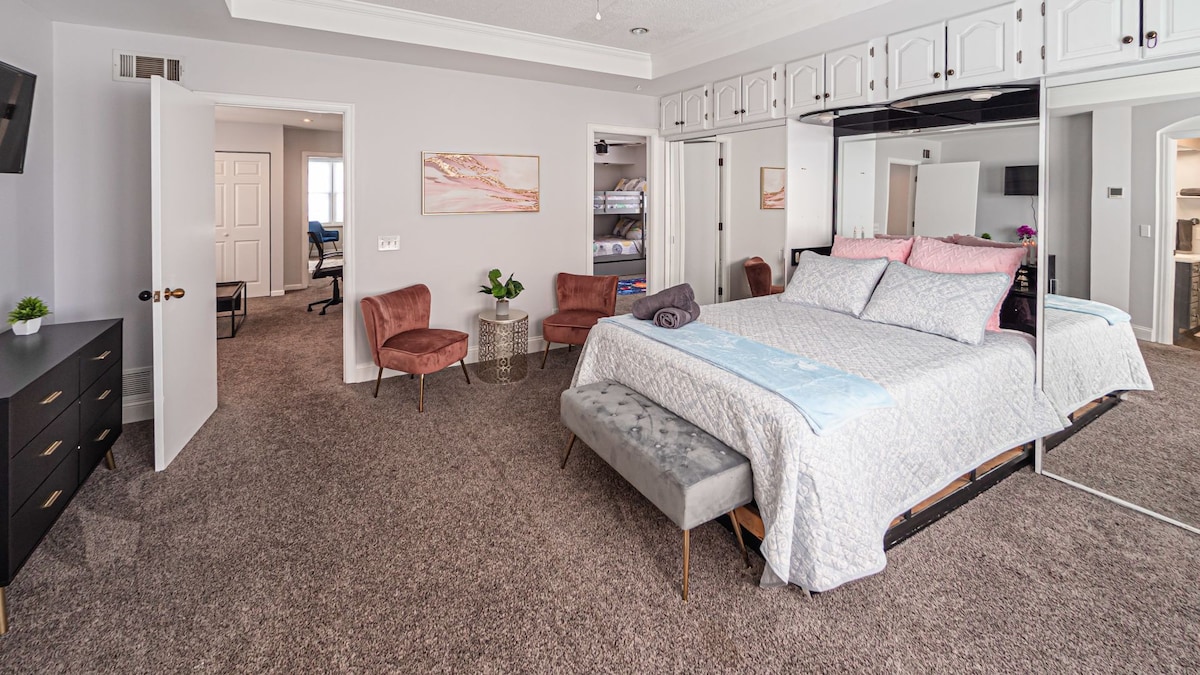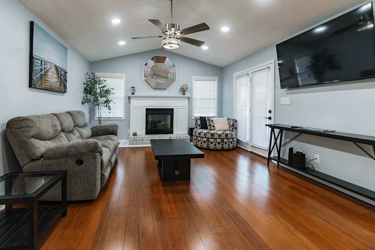 Enjoy your stay at The Heart of Main! Our newly renovated house with modern upgrades, 4 bedrooms and 3 full bathrooms. -3 Queen & 2 King comfortable beds sleeping 10 adults -Wifi throughout the house -Outdoor porch seating -Electric Fireplace -Stocked kitchen -55" Smart TV in living room & 43" Smart TVs in rooms - Street parking and private parking -Within walking distance of excellent local eateries -Along N Main St walking trail -5 Min from Downtown/Ford Center -10 Min from Haynies Corner