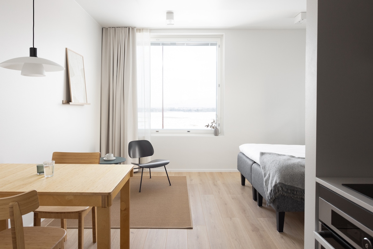 Noli Katajanokka II provides 226 stylish studios with comfortable beds, well-equipped kitchens and essential amenities. It features shared spaces like a rooftop sauna, wine bar, cozy café and convenient co-working areas. The pièce de résistance is the stunning observation deck on top of the building, where guests can unwind and enjoy panoramic views. The neighboring OleFit gym is in use for all guests. Unique blend of homely comfort and hotel conveniences ensure a memorable and convenient stay.