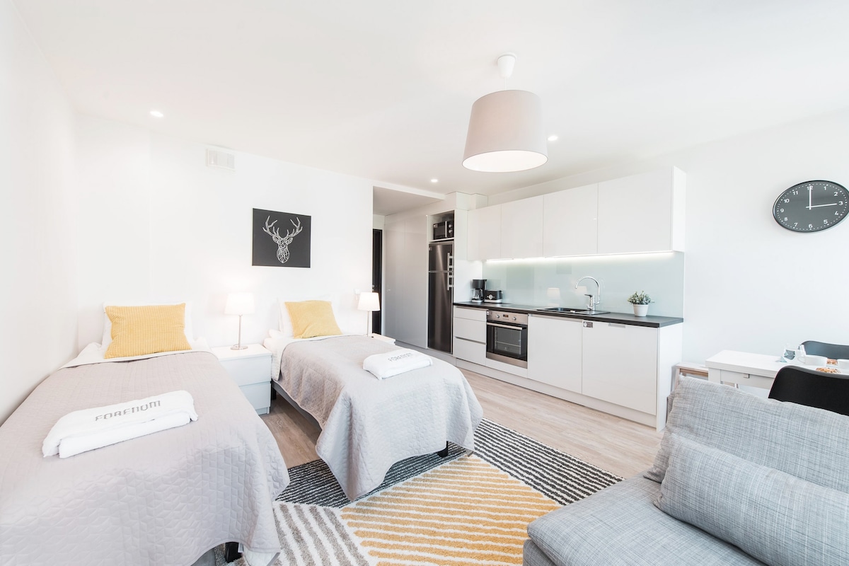 Step into our fully furnished studio! It comes with a bed, table and chairs, cabinets, lighting, basic home appliances, a laundry machine, textiles and accessories. The kitchen, bedroom, and bathroom combo brings a contemporary, modern twist to the space. Ready to roll for a day, a week, or a month – this studio is your home away from home. Just come as you are and make the most of your stay!