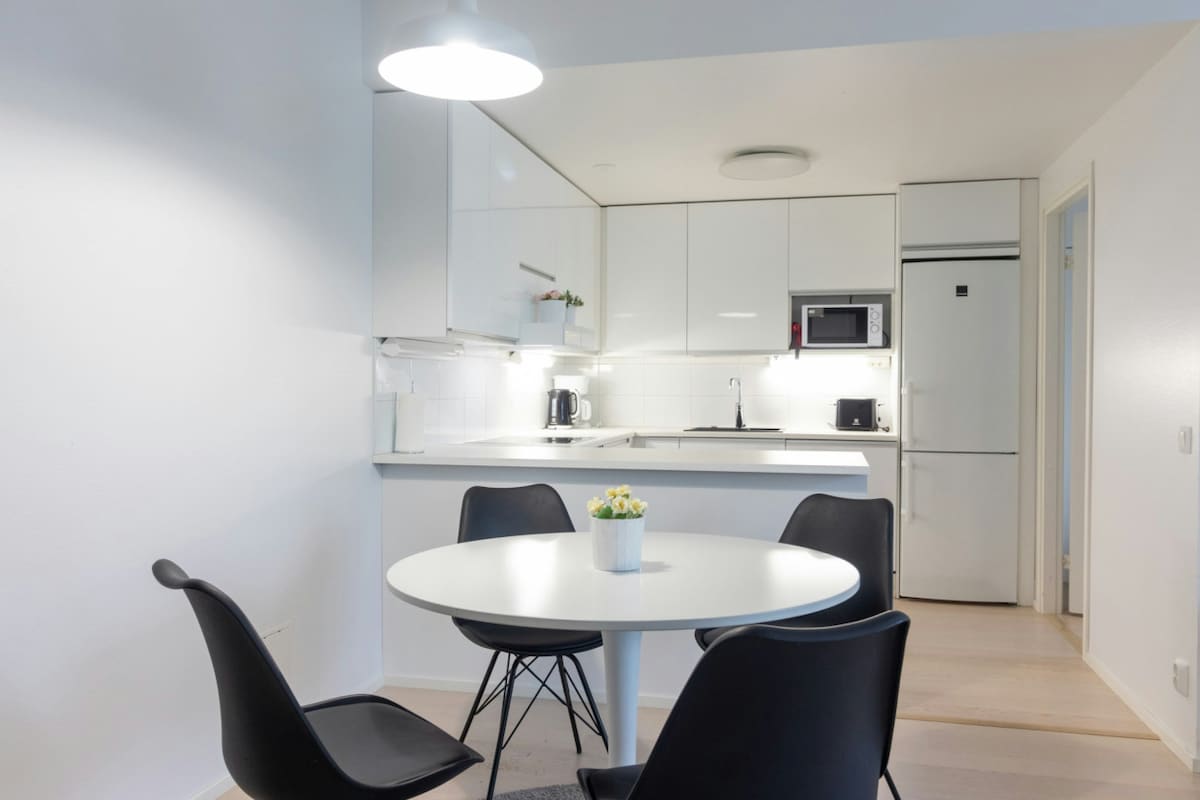 Welcome to a stylish one-bedroom apartment in Vuosaari, Helsinki, just 20 minutes by metro from the city center. Perfect for two guests, it features complimentary WiFi, a tiled bathroom with a washing machine and sauna, a balcony, and a fully equipped kitchen. The Columbus shopping center and beautiful beaches are nearby. Parking is included.