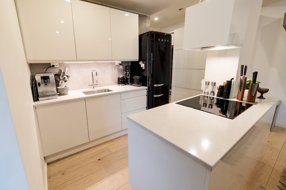Escape the city hustle and leave stress behind in this urban retreat of comfort and style in Lauttasaari, Helsinki. Highlights: - Dreamy sumptuous king-sized bed (180cm) - Fully equipped kitchen made for foodies - Espresso coffee every morning - Large cozy sofa, 65'' TV & Netflix - Hot shower with complimentary products Grocery, pharmacy, cafe, bakery, restaurants, wine store, bus stop etc. are in walking distance and Helsinki city center is only 10 min by bus or metro.