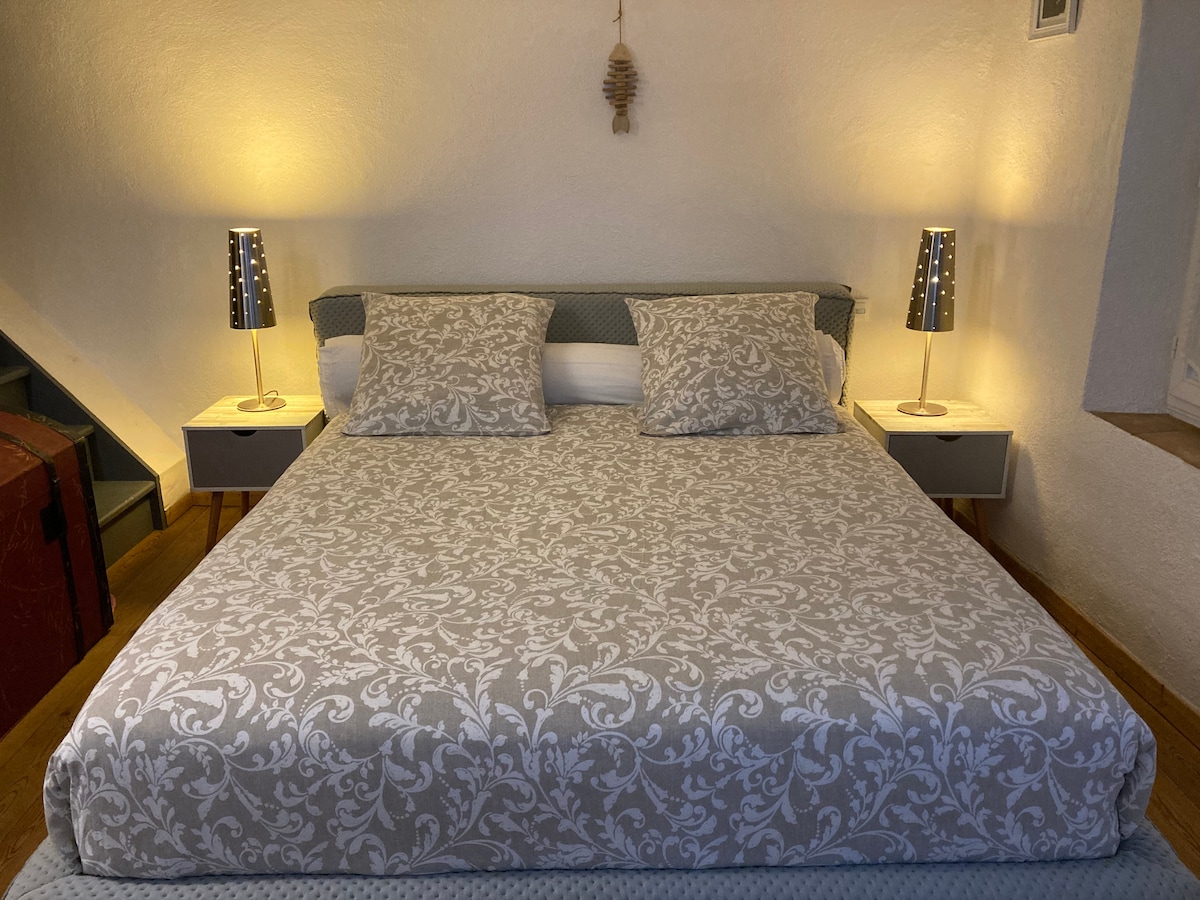 Dans une ruelle calme du vieux village, chambre 30m2 entièrement indépendante à l'étage, dressing indépendant comprenant baignoire, salle d'eau, wc, petit réfrigérateur, machine nespresso, café, thé, accès direct et privatif à la terrasse sur le toit. Parking numéroté privatif clos à 50m. Vous entrerez par la porte principale de notre maison. L’étage vous est réservé. Il n'y a pas de chambre à coté, nous dormons deux niveaux plus bas.