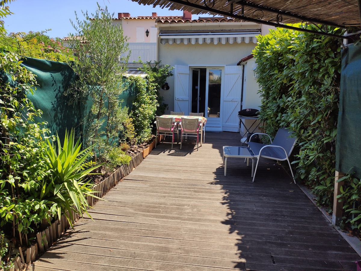 Petite maison atypique en impasse très calme plein pied et mezzanine Climatisation jardin ombragé/barbecue - coin repas parking devant maison 2 places PLAGES 3mn à pied la Verne (surveillee) 10 mn à pied Fabregas (restaurant) 10 mn voiture Sablettes (restaurants, bars, lunapark, marches, animations) Domaine de Fabregas 10 mn à pied (promenade en foret , producteur bio) Petits commerces 5 mn en voiture - supermarché à 10 minutes animaux acceptés OPTIONS menage et linge de maison