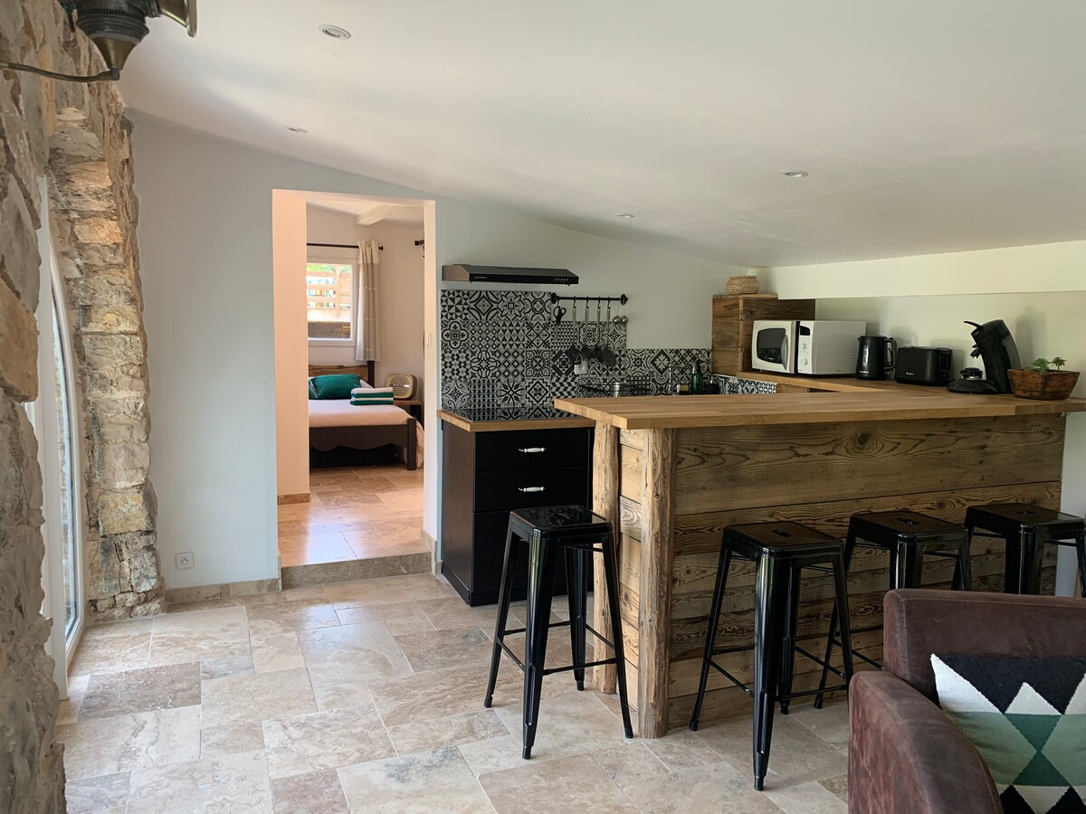 Une jolie dépendance, 35 m², pour 2 personnes ( possibilité 2 enfants dans le canapé lit) au sein d'un grand jardin Méditerranéen. Nous vous accueillerons sur notre propriété au calme, à 15 min. à pied du charmant village de Cotignac. Nous partagerons notre piscine avec plaisir. Cotignac est un village provençal réputé, à 1 heure d'Aix et de Marseille, des plages de la côte varoise ou de la côte bleue, et à 30 min. des gorges du Verdon et de ses lacs. English spoken.