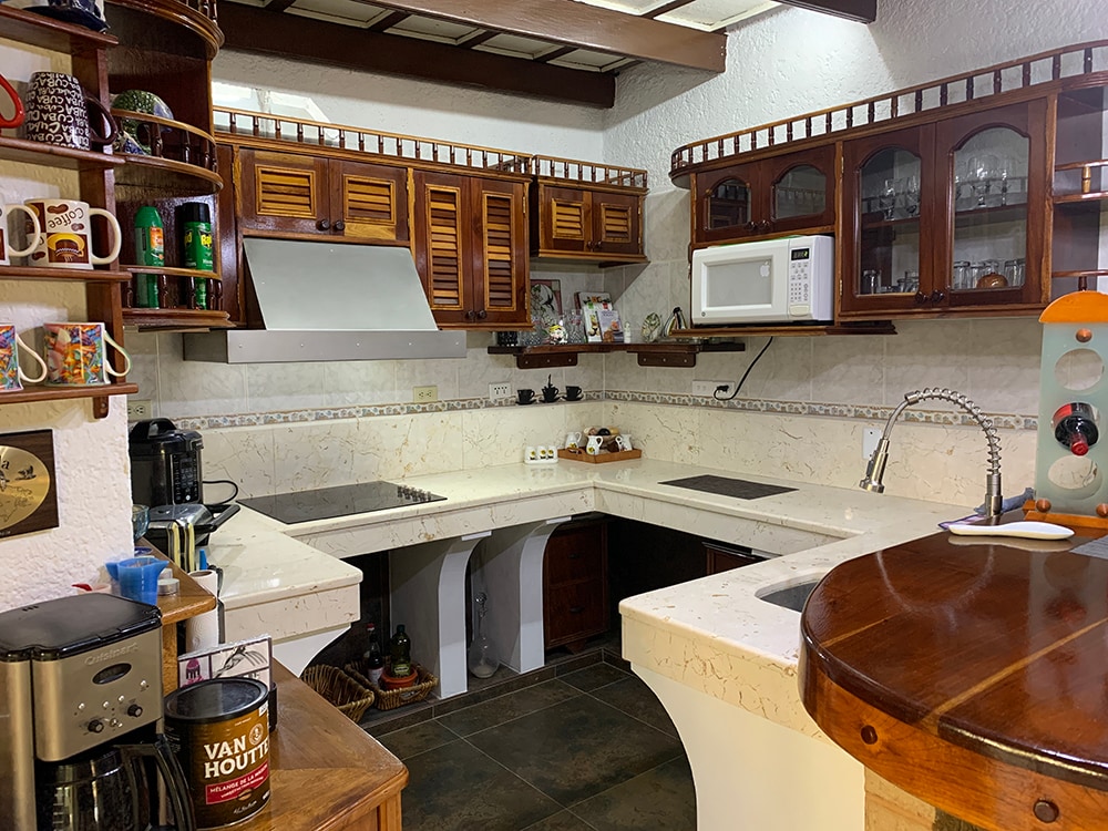 Es un apartamenento independiente amplio. Con un dormitorio con dos camas, (una grande y otra más pequeña), aire acondicionado, caja fuerte, perchas para la ropa y televisor. Un baño con agua fría y caliente; cocina equipada con todo para la elaboración de alimentos (microondas, cafetera, tostadora, ollas, fogón de gas, refrigerador), una pequeña mesa plegable y tres taburetes para comer, uso de la lavadora. Una terraza común rodeada de plantas con sillones, mesa y sillas y un hermoso jardín.